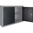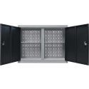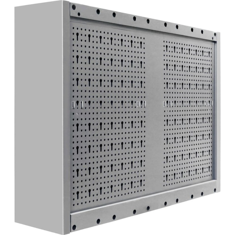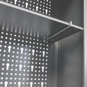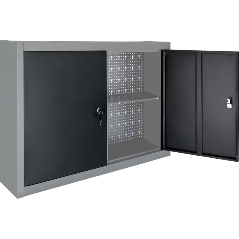 Szafka ma dwie półki o regulowanej wysokości i perforowaną płytę z otworami Euro, która może być używana do wieszania różnych narzędzi, takich jak klucze, szczypce, młotki itp. Wyposażona w dwoje zamykanych drzwi (załączone są po 2 kluczyki do każdych drzwiczek) szafka zapewnia dodatkowe bezpieczeństwo. Metalowa konstrukcja z wyjątkowo mocną, odporną na zarysowania powłoką sprawia, że mebel jest wytrzymały i łatwy w czyszczeniu. Produkt wymaga montażu.