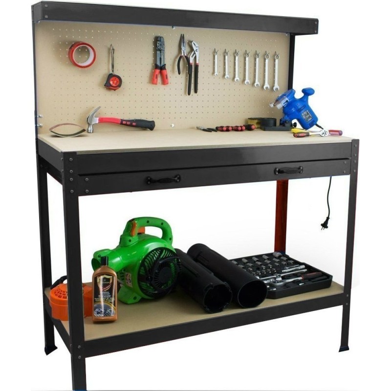 Nasz stół znajdzie praktyczne zastosowanie w każdym warsztacie, garażu czy pomieszczeniu gospodarczym. Duża szuflada na przechowywanie narzędzi, uchwyty na których można powiesić klucze i półka na dowolne akcesoria.W twoim garażu nareszcie zapanuje porządek. Stół został wykonany z wysokiej jakości materiałów dzięki czemu jest stabilny i wytrzyma obciążenie do 100kg. Teraz majsterkowanie będzie prawdziwą przyjemnością.