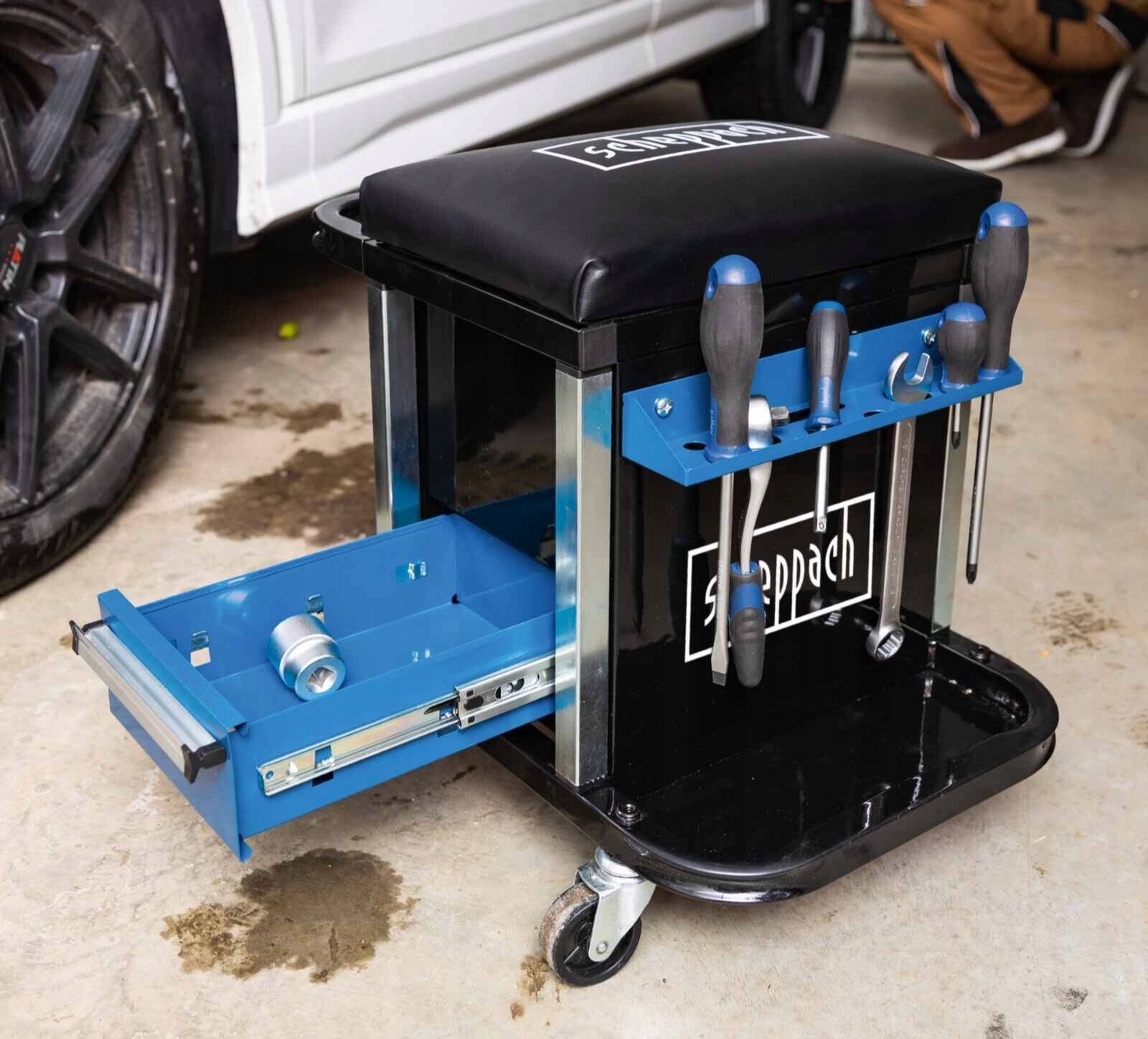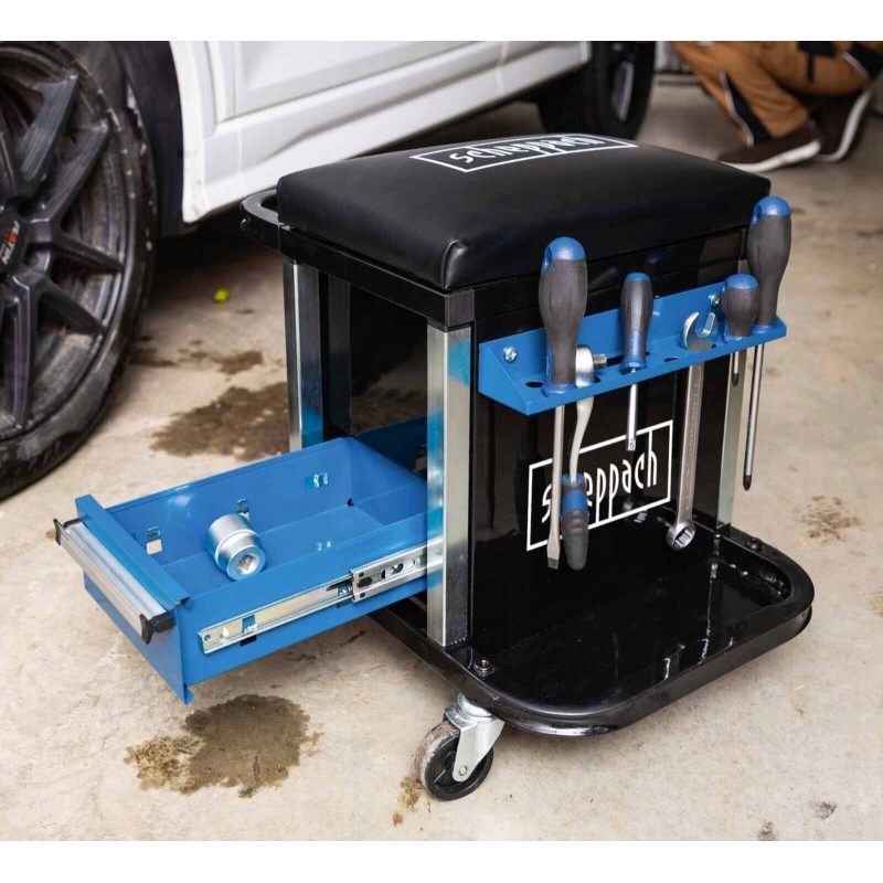 Dwie pojemne szuflady, uchwyt i schowek pod siedziskiem pozwalają na przechowywanie narzędzi i akcesoriów. Dzięki czterem lekko bieżnym kółkom, które mogą obracać się o 360 stopni, stołek na kółkach jest bardzo elastyczny;