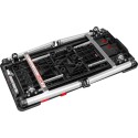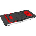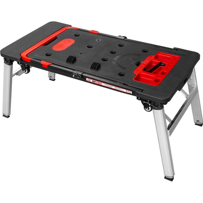Holzmann MF7IN1. Typ produktu: Przenośny stół warsztatowy, Kolor produktu: Czarny, Czerwony, Stal nierdzewna, Maksymalne obiążenie: 250 kg. Regulacja wysokości: 520 - 780 mm, Szerokość blatu roboczego: 109 cm, Głębokość blatu roboczego: 55 cm. Szerokość opakowania: 590 mm, Głębokość opakowania: 1140 mm, Wysokość opakowania: 115 mm