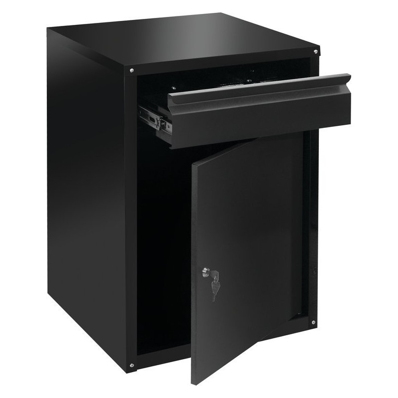 Szafka składa się z korpusu, w którym znajdują się drzwiczki z zamkiem na kluczyk oraz jedna solidna szuflada na prowadnicach kulkowych.