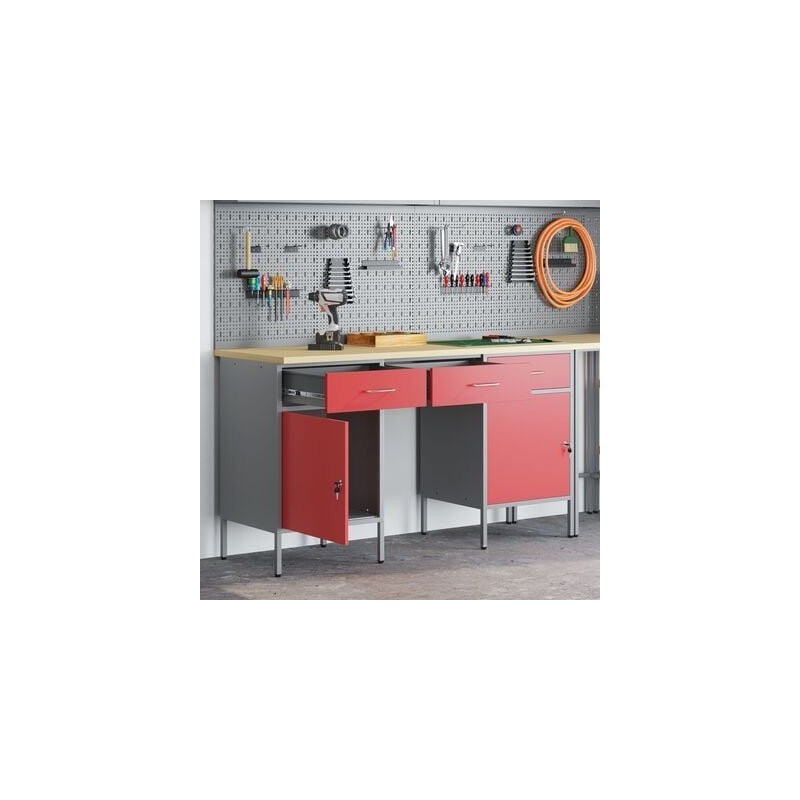 Ta industrialna szafka robocza łączy funkcjonalność z mocnym stylem, co czyni ją idealną do warsztatów, garaży i biur. Oferuje praktyczne przechowywanie i nadaje przestrzeni elegancki wygląd. Solidna konstrukcja z stali i materiału drewnopochodnego oraz przyciągające wzrok czerwone i szare kolory sprawiają, że ta szafka nie tylko sprząta przestrzeń, ale również dodaje jej stylu.