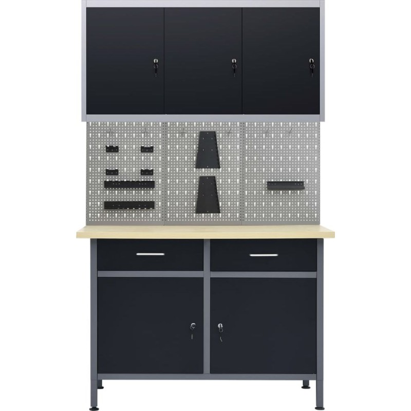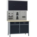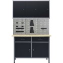 Zestaw ten łączy 1 stół roboczy, 3 panele ścienne i 1 szafkę ścienną, stanowiąc praktyczne rozwiązanie kwestii przechowywania w warsztacie lub garażu.