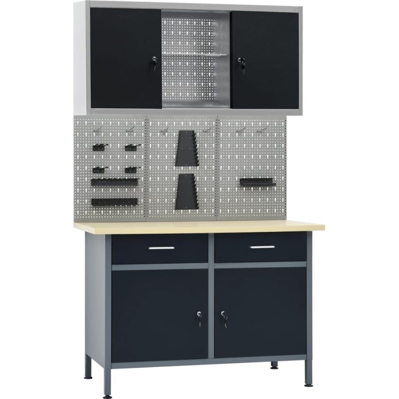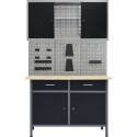 Zestaw ten łączy 1 stół roboczy, 3 panele ścienne i 1 szafkę ścienną, stanowiąc praktyczne rozwiązanie kwestii przechowywania w warsztacie lub garażu.