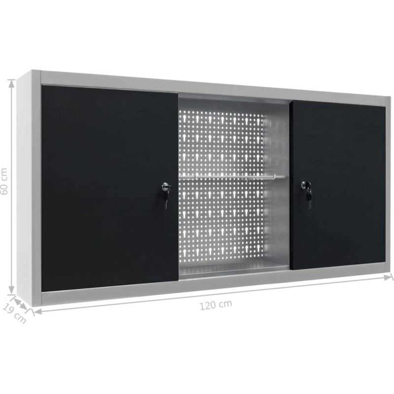 Mebel ma trzy półki o regulowanej wysokości i perforowaną płytę z otworami, która może posłużyć do wieszania różnych narzędzi, takich jak klucze, szczypce, młotki itp. Wyposażona w dwoje zamykanych drzwiczek (załączone są po 2 kluczyki do każdych z nich) szafka zapewnia większe bezpieczeństwo. Metalowa konstrukcja z wyjątkowo mocną, odporną na zarysowania powłoką sprawia, że mebel jest wytrzymały i łatwy w czyszczeniu. Produkt wymaga montażu.