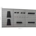 Panele narzędziowe, wykonane z solidnej stali, mogą utrzymać ciężar różnych sprzętów, takich jak: wiertarki, szczypce, śrubokręty i klucze. Płyty są perforowane, aby móc łatwo i bezpiecznie powiesić narzędzia. 3 panele można połączyć razem, aby zwiększyć ich sztywność. Jest to idealny dodatek do Twojego stołu roboczego i szafki w warsztacie za sprawą szerokości 120 cm.