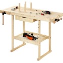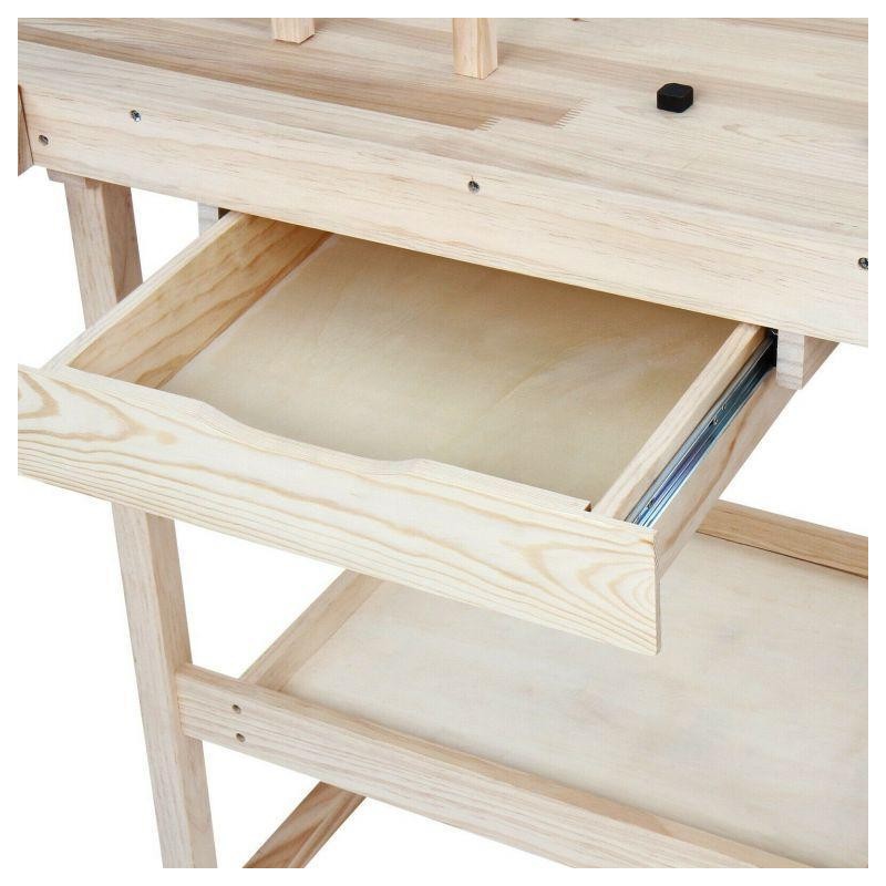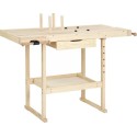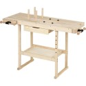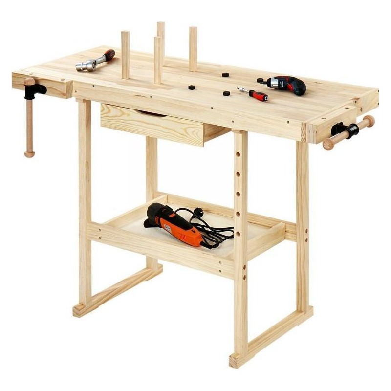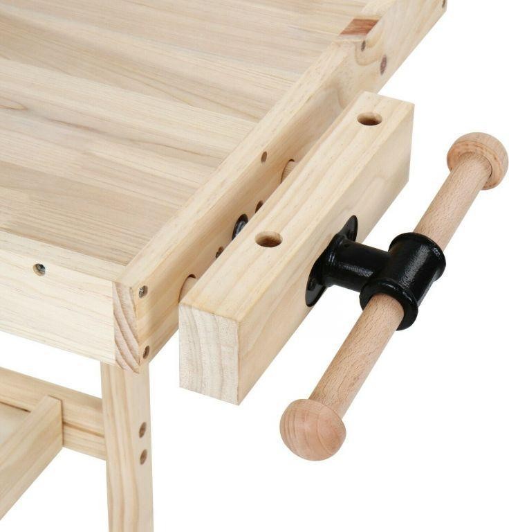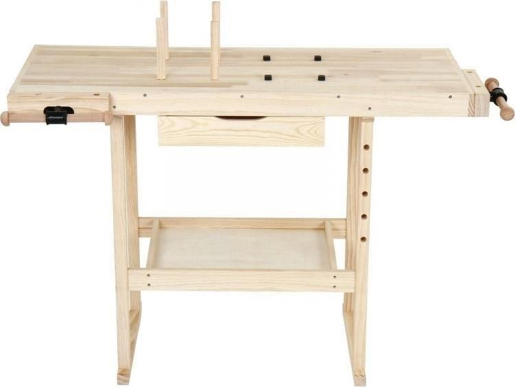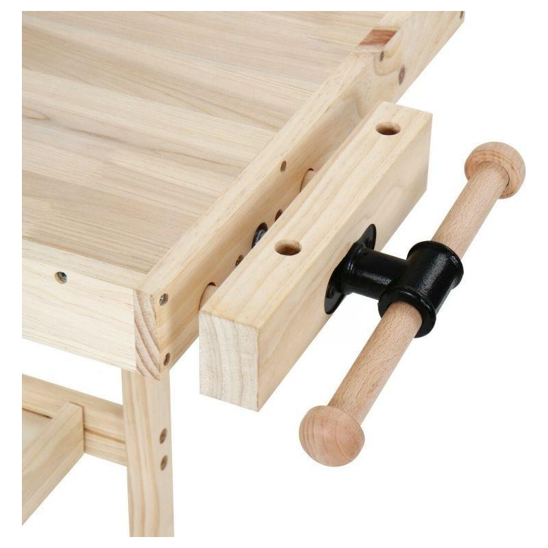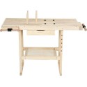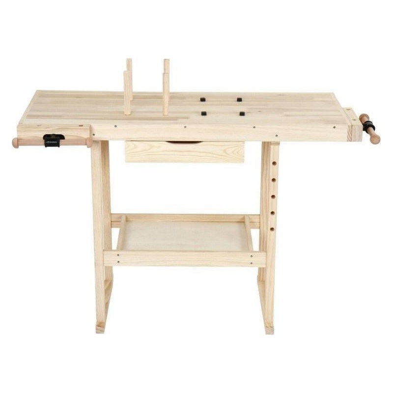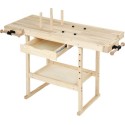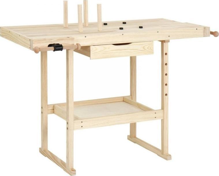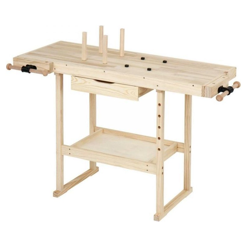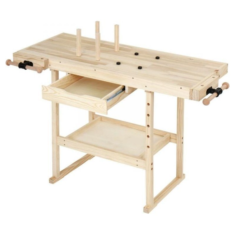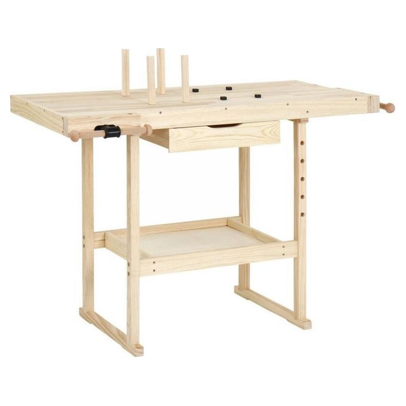 Materiał tego stołu jest solidny, więc stół jest solidny i gwarantuje doskonałą stabilność. To sprawia, że biurko jest idealnym pomocnikiem w pracy. Dwa boczne napinacze mocują obrabiane przedmioty do stołu. Aby zapewnić bezpieczną pracę na blacie, przymocowane są cztery kołki blokujące. Przestrzeń do przechowywania została stworzona pod blatem w postaci szuflady oraz wolnej przestrzeni ładunkowej pod nią. Narzędzie, które można zawiesić, można zawiesić na przedniej części drewnianej nogi stołu. To biurko jest naprawdę praktyczne. Dane techniczne: materiał: drewno jodłowe miejsce do przechowywania: półka i szuflada boczne napinacze do mocowania obrabianych przedmiotów do stołu kołki blokujące do mocowania obrabianych przedmiotów do powierzchni stołu 4 miejsca do zawieszania narzędzi wymiary całkowite: 127 x 57,5 x 82,5 cm (dł. x szer. x wys.) wymiary powierzchni roboczej: 117 x 47,5 x 83 cm (dł. x szer. x wys.) średnica otworu: 16 mm długość klucza: 23 cm rozpiętość napinacza: 15 cm wymiary szuflady: 41 x 40 x 100 cm wymiary powierzchni magazynowej: 69 x 40 cm (półka) maksymalne obciążenie: ok. 200 kg waga całkowita: ok. 13,05 kg Zawartość opakowania: 1 x stół