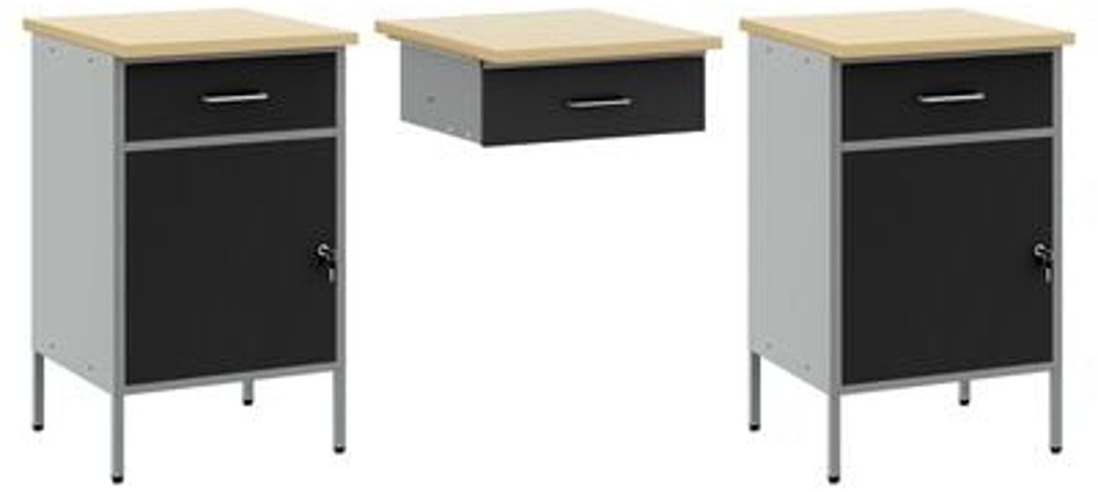 - Zawartość dostawy: 2 x szafka robocza (z 1 drzwiami i 1 szufladą), 1 x szafka robocza (z 1 szufladą)
