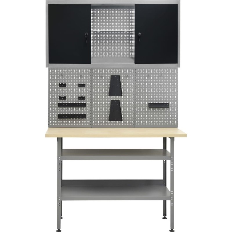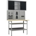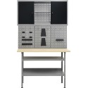 Zestaw ten łączy 1 stół roboczy, 3 panele ścienne i 1 szafkę ścienną, stanowiąc praktyczne rozwiązanie kwestii przechowywania w warsztacie lub garażu.