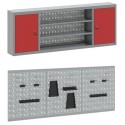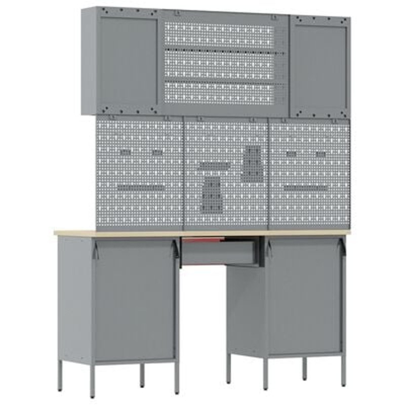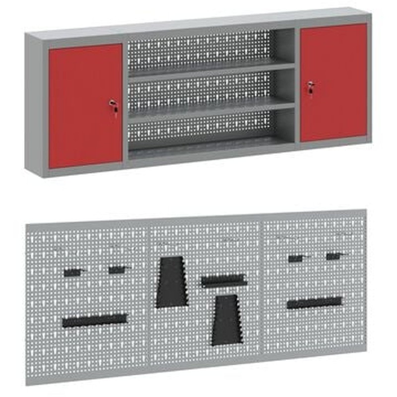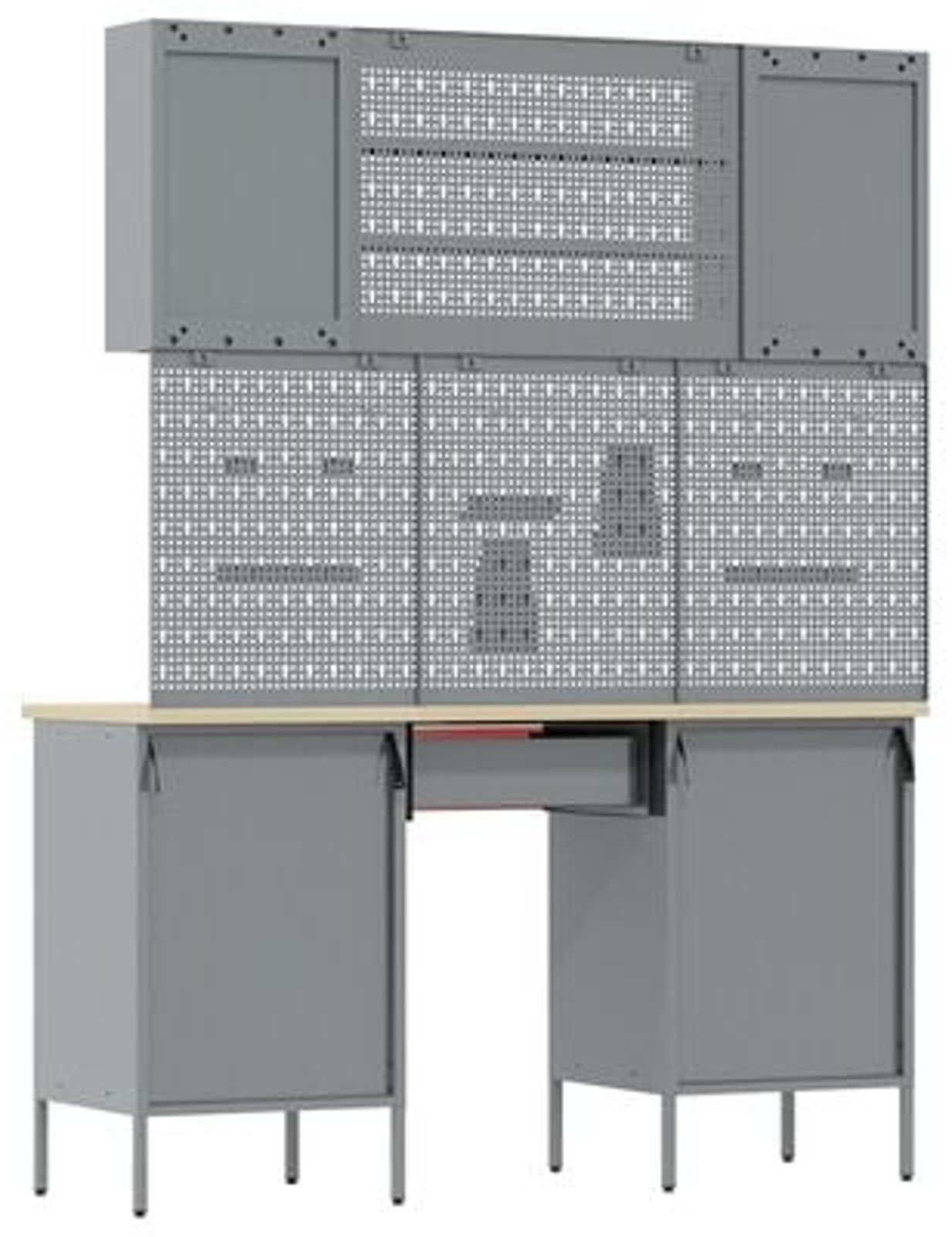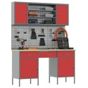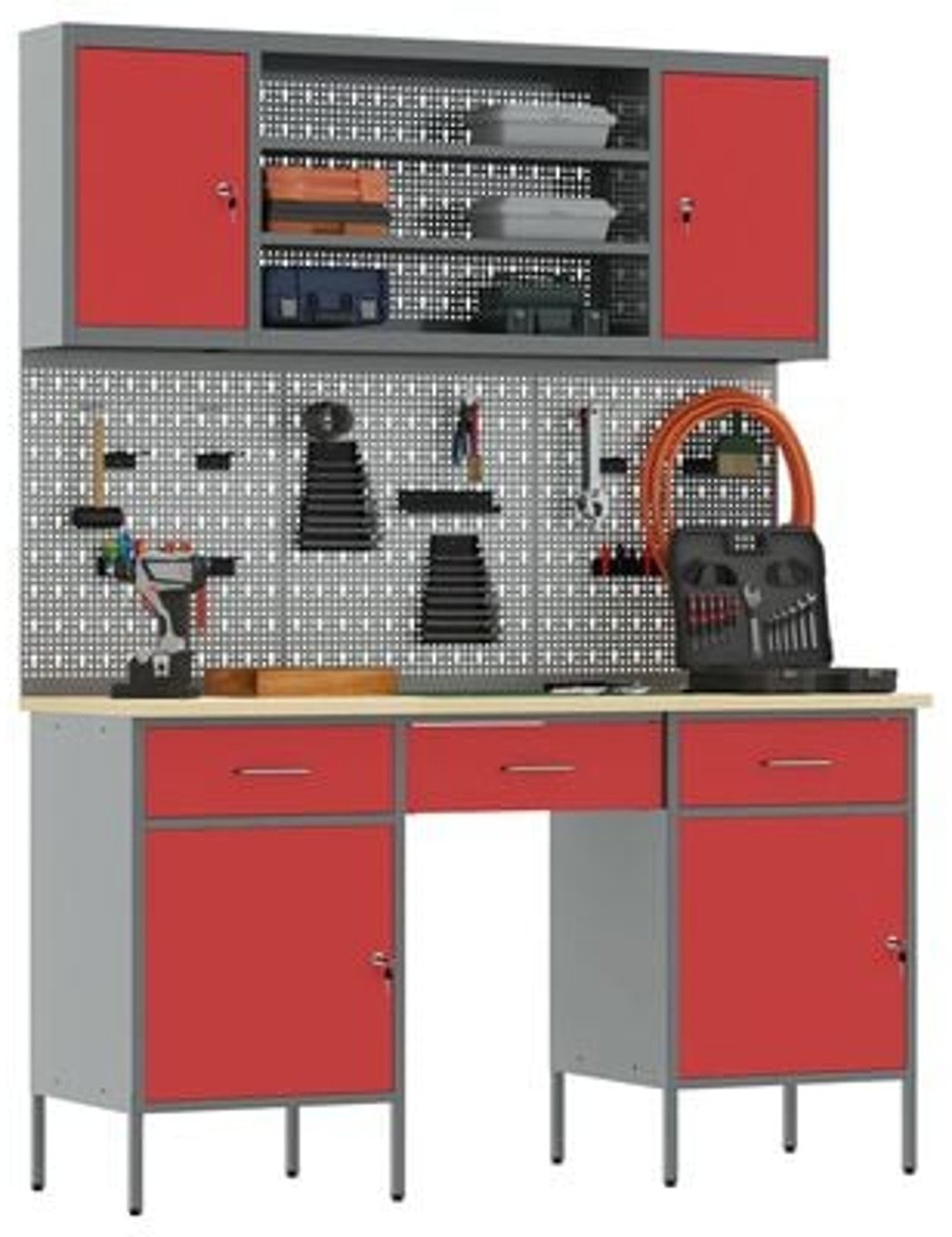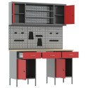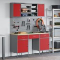 - Zawartość dostawy: 2 x szafka robocza (z 1 drzwiami i 1 szufladą), 1 x szafka robocza (z 1 szufladą), 3 x panel ścienny na narzędzia, 1 x szafka narzędziowa
