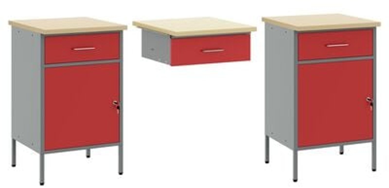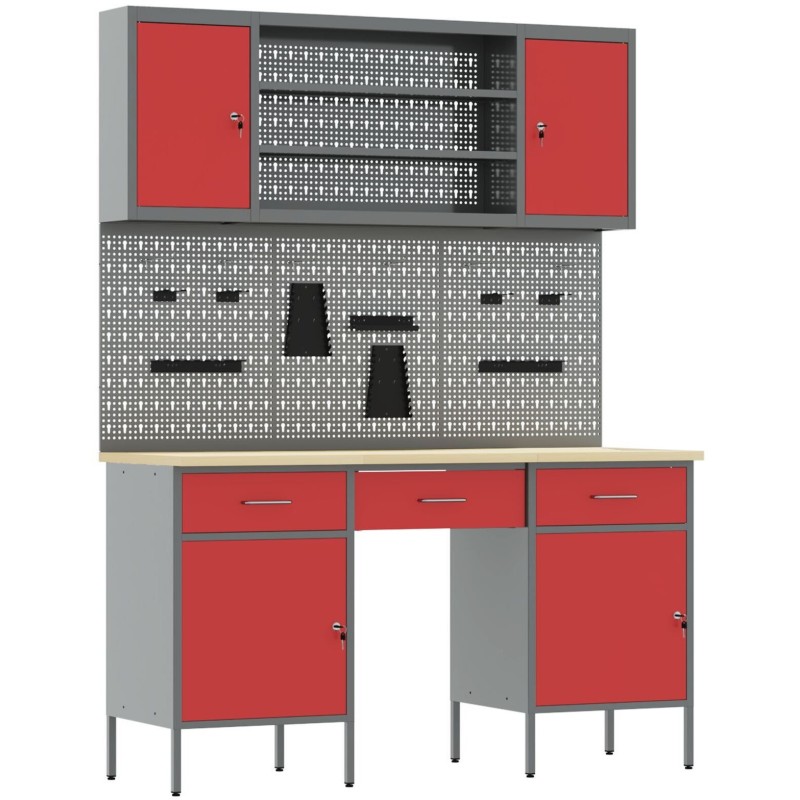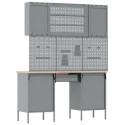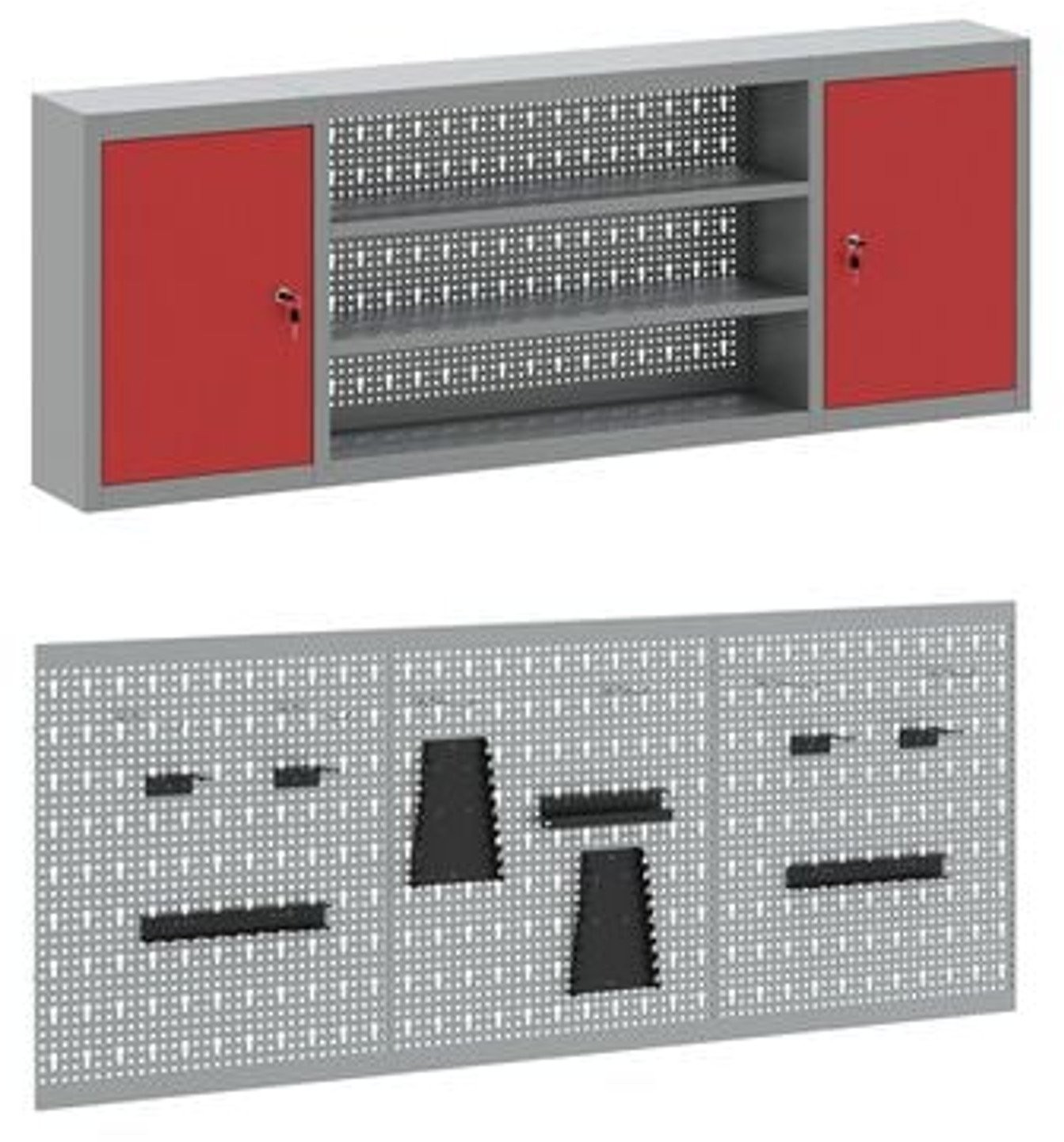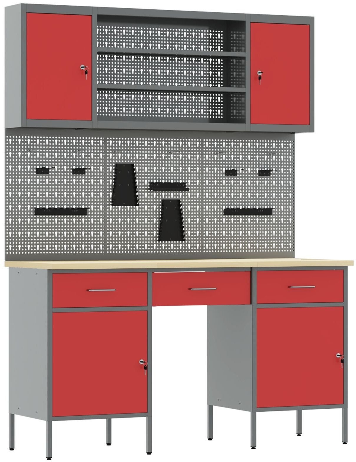 - Zawartość dostawy: 2 x szafka robocza (z 1 drzwiami i 1 szufladą), 1 x szafka robocza (z 1 szufladą), 3 x panel ścienny na narzędzia, 1 x szafka narzędziowa