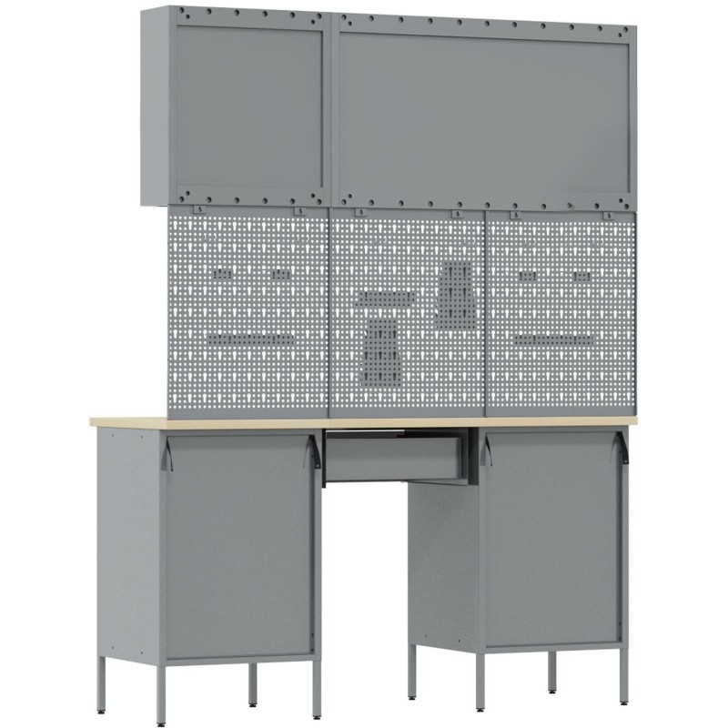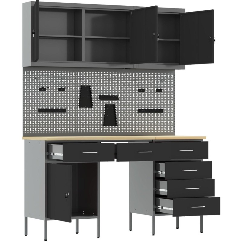 Zestaw wykonany z wysokiej jakości stali oraz drewna inżynieryjnego zapewnia stabilność i odporność na intensywne użytkowanie. Z maksymalnym obciążeniem do 150 kg, idealnie nadaje się do przechowywania narzędzi oraz innych cięższych przedmiotów, co czyni go niezawodnym wyborem dla każdego warsztatu.