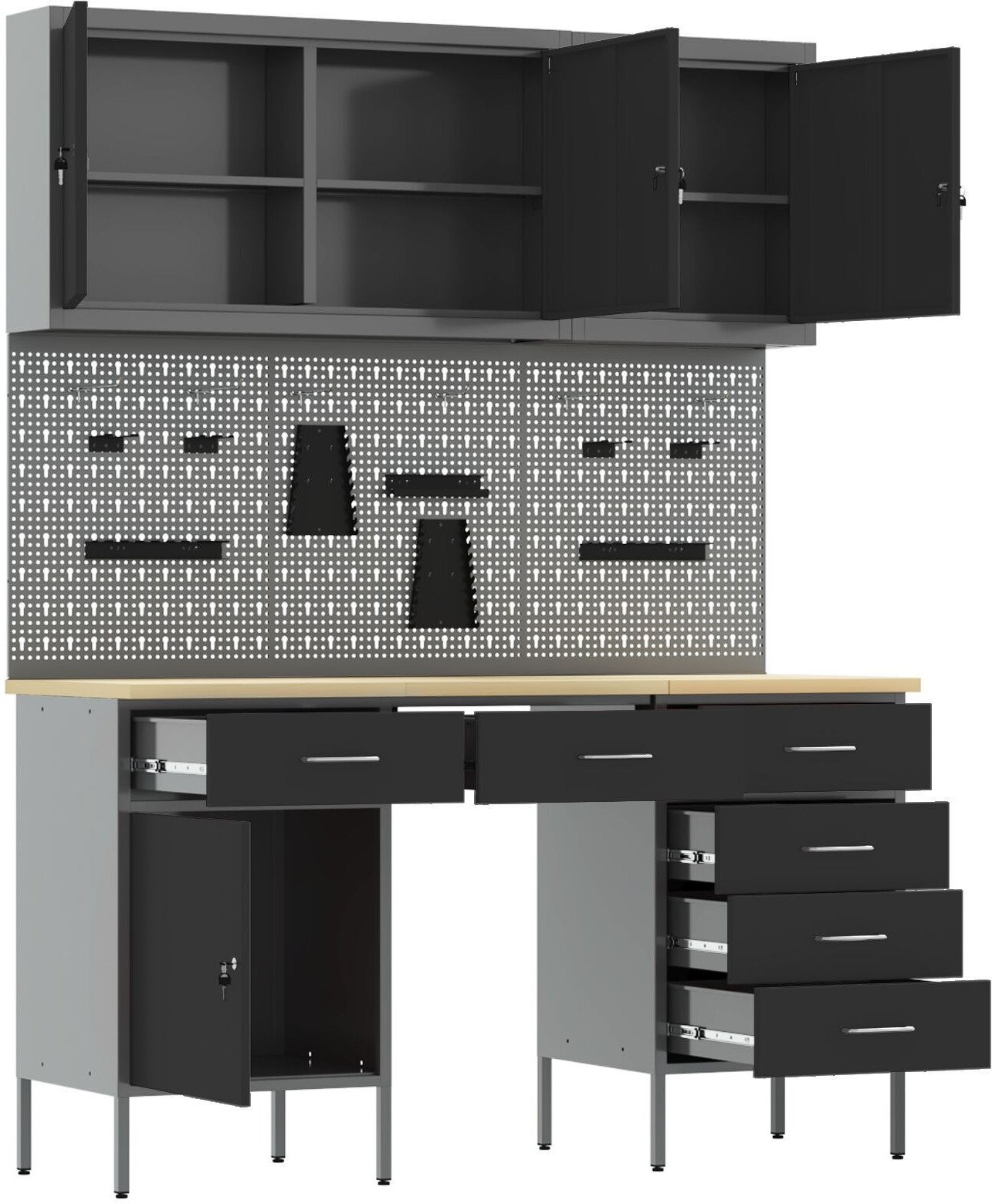 - Zawartość dostawy: 3 szafki, 3 tablice pegboard, 2 szafki narzędziowe