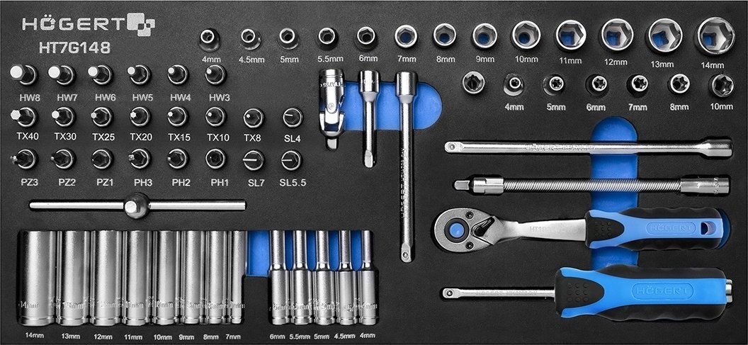 - ⏩ HT7G148 Zestaw narzędzi z grzechotką 1/4 63 szt