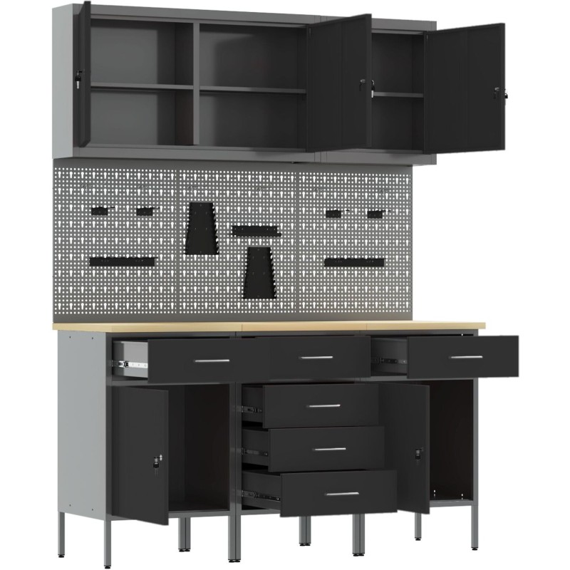 Ten zestaw szafek do warsztatu przemysłowego łączy praktyczność z solidnym wyglądem, co czyni go super wyborem do garaży i warsztatów. Zrobiony z mocnej stali i materiałów drewnopochodnych, ma stylowe czarno-szare wykończenie, które wygląda elegancko przy codziennym użytkowaniu.