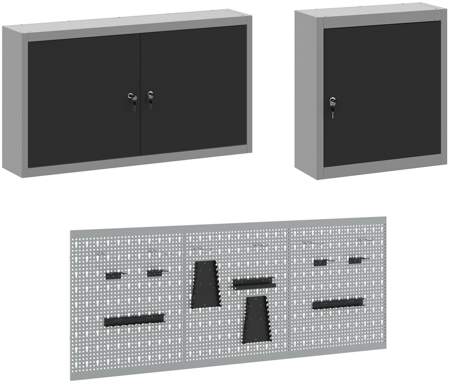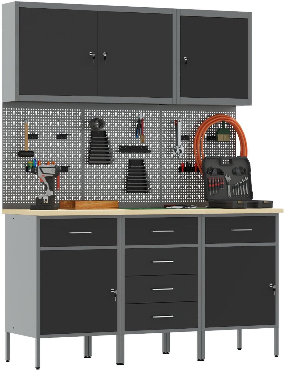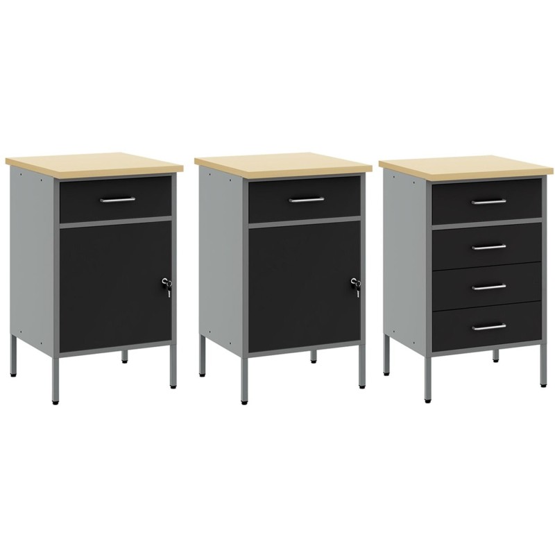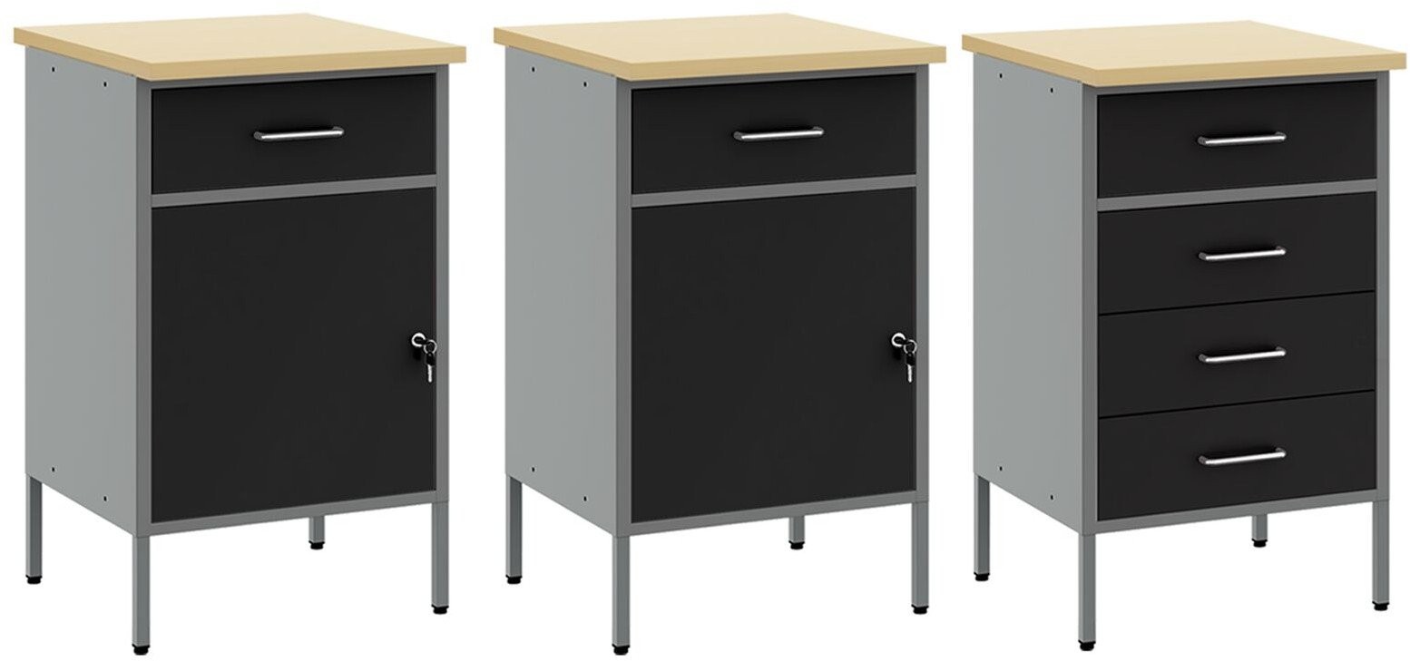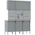 - Delivery Contains: 2 x Szafka robocza (z 1 drzwiami i 1 szufladą), 1 x Szafka robocza (z 4 szufladami), 3 x Panel narzędziowy, 1 x Szafka narzędziowa (z 1 drzwiami), 1 x Szafka narzędziowa (z 2 drzwiami)