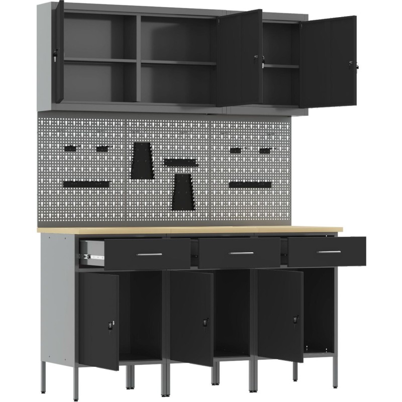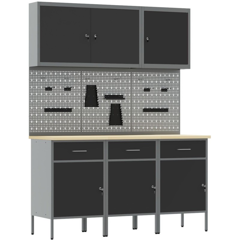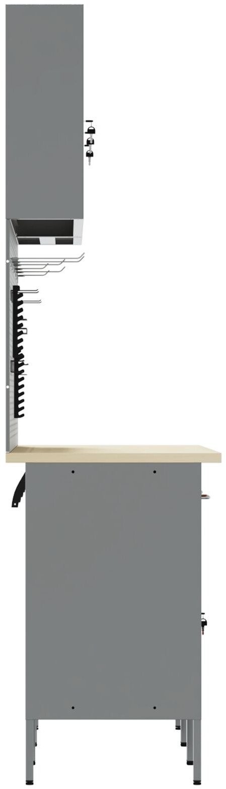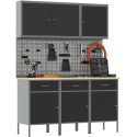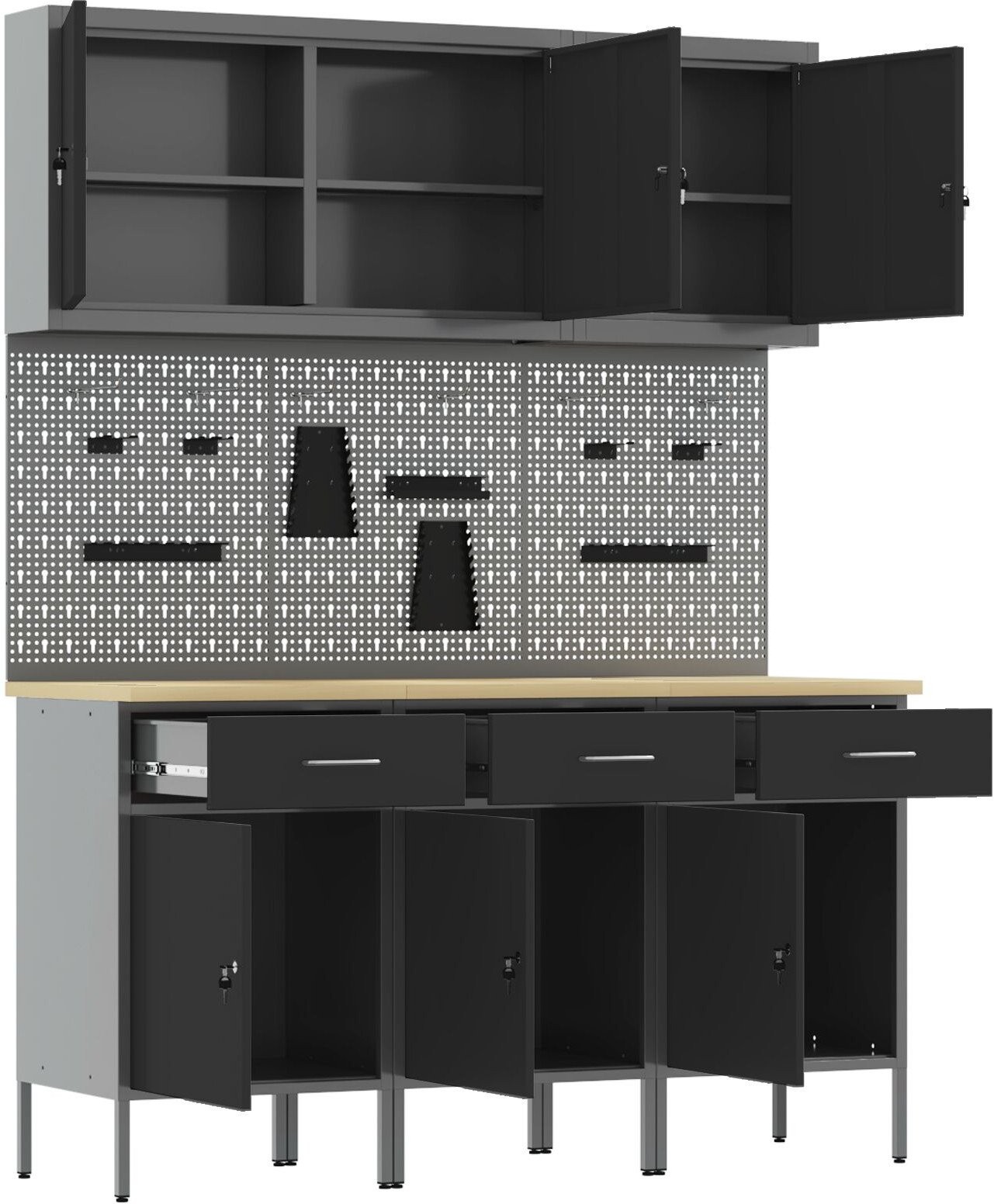 Ta stalowa szafka robocza jestpraktyczna i solidna, co czyni ją niezbędnym elementem w każdym warsztacie albo garażu. Z nowoczesnym czarnym i szarym wykończeniem oraz drewnopodobnymi akcentami na górze, nie tylko dobrze wygląda, ale też oferuje praktyczne przechowywanie dla miłośników narzędzi i DIY.