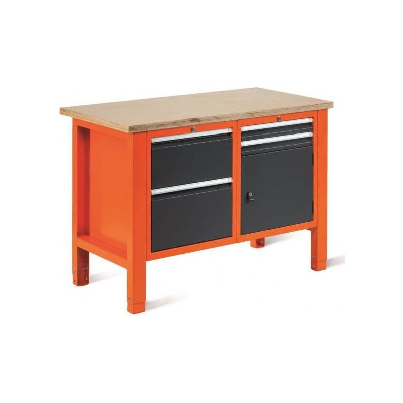Stół warsztatowy posiadający następujące cechy:Wysokość: 850-900 mmSzerokość: 1245 mmGłębokość: 620 mmWaga: 80 kgBlat - BStelaż - BSzafka - ASzafka - TDopuszczalne maksymalne obciążenie stołu dwumodułowego = 450 kg