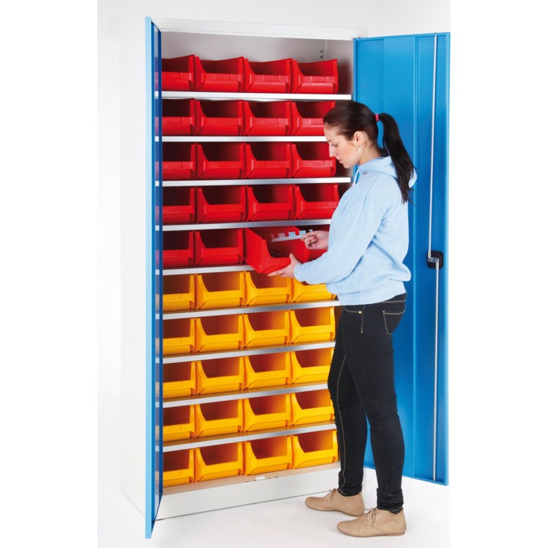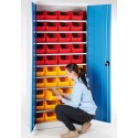 Profesjonalna specjalistyczna szafa warsztatowa do segregacji przechowywania części i podzespołów. Duża ilość pojemników w zestawie daje ogromne możliwości segregacji części i narzędzi oraz ułatwia i przyśpiesza dostęp do nich. Zamek patentowy z dwoma ryglami zabezpiecza zawartość przed dostępem osób niepowołanych. Drzwi szafy są wzmocnione w środkowej części na całej wysokości.