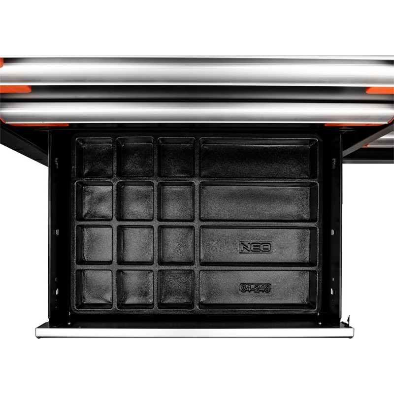 Szafka narzędziowa 12 szuflad 1105x465x825 mm (z kołami 978mm), 6 dużych w tym 3 niskie, wymiar 560 x 400 x 60 mm i 3 wysokie wymiar 560 x 400 x 139 mm, 6 małych w tym 3 niskie wymiar 252.5 x 400 x 60 mm i 3 wysokie wymiar 252.5 x 400 x 139mm, stalowy korpus, udźwig 600kg, aluminiowy blat z miejscami na wkrętaki i akcesoria, perforacja boczna na haki oraz akcesoria NEO, odbojniki narożne, uchwyt boczny, blokada szuflad, szuflady 100% otwierane, kompatybilne z wkładkami narzędziowymi Neo, prowadnice kulkowe, zamek centralny, dwa klucze, blokada kół, szuflady wyposażone w maty EVA wysokość 2mm, koła PU 5 cali. Dodatkowe wyposażenie szafki nr. ref.: 84-249, 84-247, 84-246, 84-242, 84-241, 84-240, 84-239, 84-238, 84-237, 84-236, 84-235, 84-234, 84-233, 84-232, 84-231, 84-230