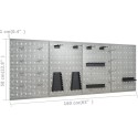 Zestaw ten łączy 1 stół roboczy, 4 panele ścienne i 2 szafki ścienne, stanowiąc praktyczne rozwiązanie kwestii przechowywania w warsztacie lub garażu. Wytrzymały stół warsztatowy, wyróżnia się dużą przestrzenią do przechowywania i ładownością 500 kg. Duży i solidny blat stanowi stabilną platformę do wszystkich prac naprawczych. Stół warsztatowy ma 6 szuflad, aby odpowiednio uporządkować narzędzia, części i akcesoria, takie jak śruby, gwoździe i taśma klejąca. Wszystkie szuflady wyposażone są w prowadnice z łożyskami kulkowymi w celu płynnego przesuwania. Mebel ma 2 półki i dużą przestrzeń z 2 zamykanych drzwiczek, w których można łatwo pomieścić wiertarki, bębny z kablami i szlifierki. Dodatkowo stopki mają regulowaną wysokość. Ta stacja robocza wykonana jest z najlepszej stali i płyty wiórowej, dzięki czemu jest wyjątkowo wytrzymała, trwała i łatwa do czyszczenia. Zestaw jest łatwy w montażu. Te panele narzędziowe, wykonane z solidnej stali, mogą utrzymać ciężar różnych narzędzi, takich jak: wiertarki, szczypce, śrubokręty i klucze. Płyty są perforowane, aby móc łatwo i bezpiecznie powiesić narzędzia. 4 panele można połączyć razem, aby zwiększyć ich sztywność. Jest to idealne rozwiązanie do Twojego stołu roboczego i szafki w warsztacie za sprawą szerokości 160 cm. Mebel ma dwie przestawne półki i perforowaną płytę z otworami, która może posłużyć do wieszania różnych narzędzi, takich jak klucze, szczypce, młotki itp. Wyposażona w dwoje zamykanych drzwiczek (załączone są po 2 kluczyki do każdych z nich) szafka zapewnia większe bezpieczeństwo. Metalowa konstrukcja z wyjątkowo mocną, odporną na zarysowania powłoką sprawia, że mebel jest wytrzymały i łatwy w czyszczeniu. Produkt wymaga montażu.Stół warsztatowy:Kolor: czarny, szaryMateriał: stal, płyta wiórowa, stop metaliWymiary: 160 x 60 x 85 cm (dł. x szer. x wys.)Grubość blatu: 3 cmMaksymalne obciążenie: 500 kgMaksymalne obciążenie pojedynczej szuflady: 10-15 kgZ 6 szufladami na prowadnicach z łożyskami kulkowymiZ 2 szafkami z drzwiczkami zamykanymi na kluczBlat ze słojami przypominającymi drewnoStopki z regulacją wysokościWymagany montaż: takOSTRZEŻENIE: aby zapobiec przewróceniu się produktu, należy zastosować dołączone elementy do przymocowania go na ścianie.Panel ścienny:Kolor: szary Materiał: stalWymiary (pojedynczej sztuki): 40 x 58 x 1 cm (dł. x szer. x gr.)Grubość metalu: 0,5 mmŚrednica małego otworu: 5,5 mmWymiary podłużnego otworu: 9,4 x 22,5 mm (szer. x wys.)Różne otworySzafka wisząca:Kolor: szaro-czarnyMateriał: metal Wymiary (każdej): 80 x 19 x 60 cm (szer. x gł. x wys.) Z 2 przestawnymi półkami z wieszakami i 1 perforowaną płytą z otworami Z 2 zamykanymi drzwiczkami (do każdych drzwi dołączone są 2 klucze)Wymagany montaż: takZawartość przesyłki:1 x stół warsztatowy4 x panel ścienny21 x akcesorium montażowe2 x szafka wisząca...