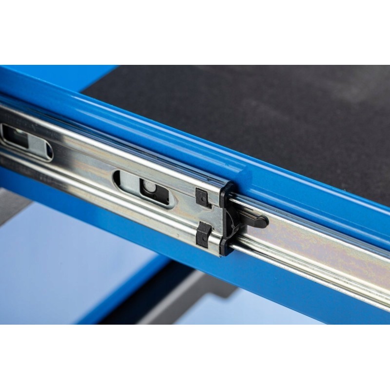 Mechanizm domykania szuflad chroni przed samoczynnym wysuwaniem, a pełne otwieranie ułatwia dostęp do narzędzi.