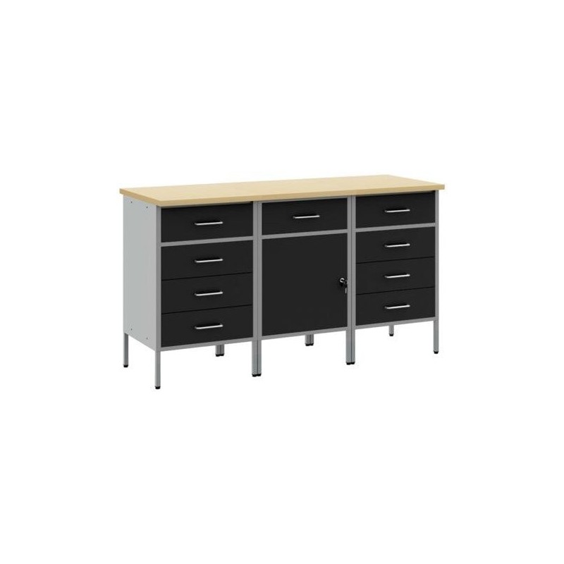 Zestaw zawiera szafkę z jedną szufladą oraz zamykanym schowkiem, co umożliwia bezpieczne przechowywanie narzędzi. Dodatkowo, dwie szafki robocze z czterema szufladami ułatwiają organizację i szybki dostęp do potrzebnych rzeczy. Dzięki przemyślanej konstrukcji, każdy element zestawu wspiera efektywność pracy.