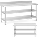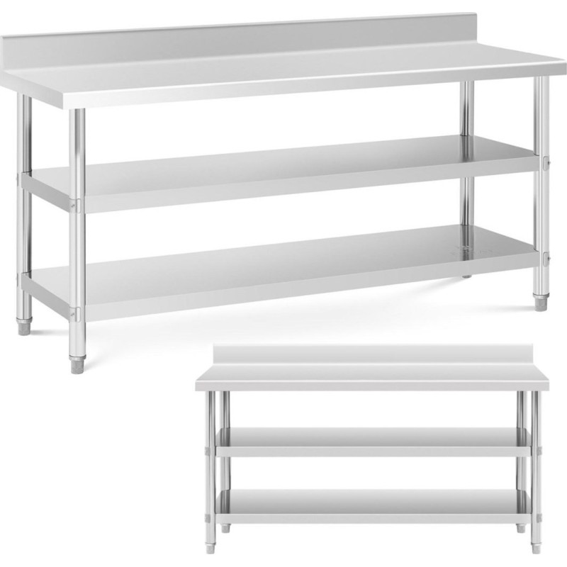 Stół marki Royal Catering został zaprojektowany specjalnie z myślą o wysokich wymaganiach w branży gastronomicznej. Dzięki trzypoziomowej konstrukcji oferuje dużą powierzchnię do przechowywania. Dolne półki pomieszczą akcesoria o wysokości 29/26 cm. Powierzchnia robocza stołu ma 200 x 70 x 16.5 cm i zapewnia dużo miejsca do codziennej pracy. Masywne, okrągłe nogi stołu nierdzewnego o średnicy 48 mm stabilizują i zwiększają maksymalną nośność do 226 kg. Rant o wysokości 115 mm chroni ścianę przed zabrudzeniami. Nóżki są regulowane w zakresie 50-60 mm. Stół wykonany został ze stali nierdzewnej, jest wytrzymały, odporny na korozję oraz uszkodzenia mechaniczne. Jest także higieniczny oraz łatwy w czyszczeniu.