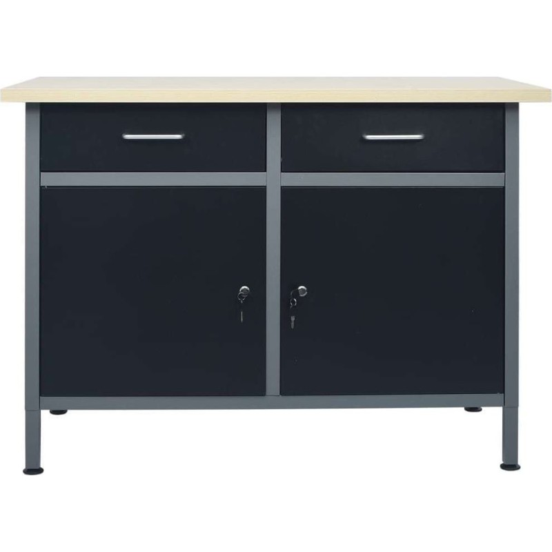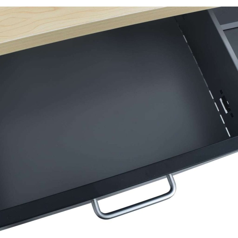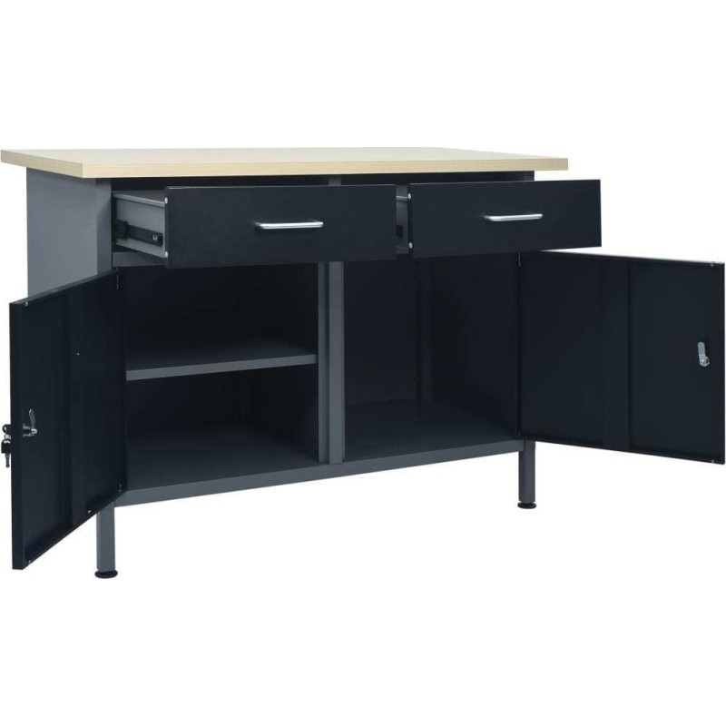 Duży i solidny blat będzie stabilnym miejscem do wszystkich prac naprawczych. Stół warsztatowy ma 2 szuflady, dzięki czemu pozwoli dobrze uporządkować narzędzia, części i akcesoria, takie jak śruby, gwoździe i taśmy klejące. Szuflady wyposażone są w prowadnice z łożyskami kulkowymi w celu płynnego wysuwania. Mebel ma również odpowiednie przegrody na większe narzędzia i 2 szafki z zamykanymi drzwiami, w których można łatwo pomieścić wiertarki, kable na bębnach i szlifierki.
