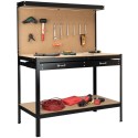 Stół warsztatowy HORTEN oferuje dwie praktyczne półki oraz perforowaną tablicę na narzędzia z 20 haczykami. Dzięki temu możesz swobodnie zaaranżować przestrzeń roboczą, co ułatwia organizację i dostęp do narzędzi. Górna półka ma maksymalne obciążenie 20 kg, a dolna półka aż 100 kg, co zapewnia dużą elastyczność w przechowywaniu.