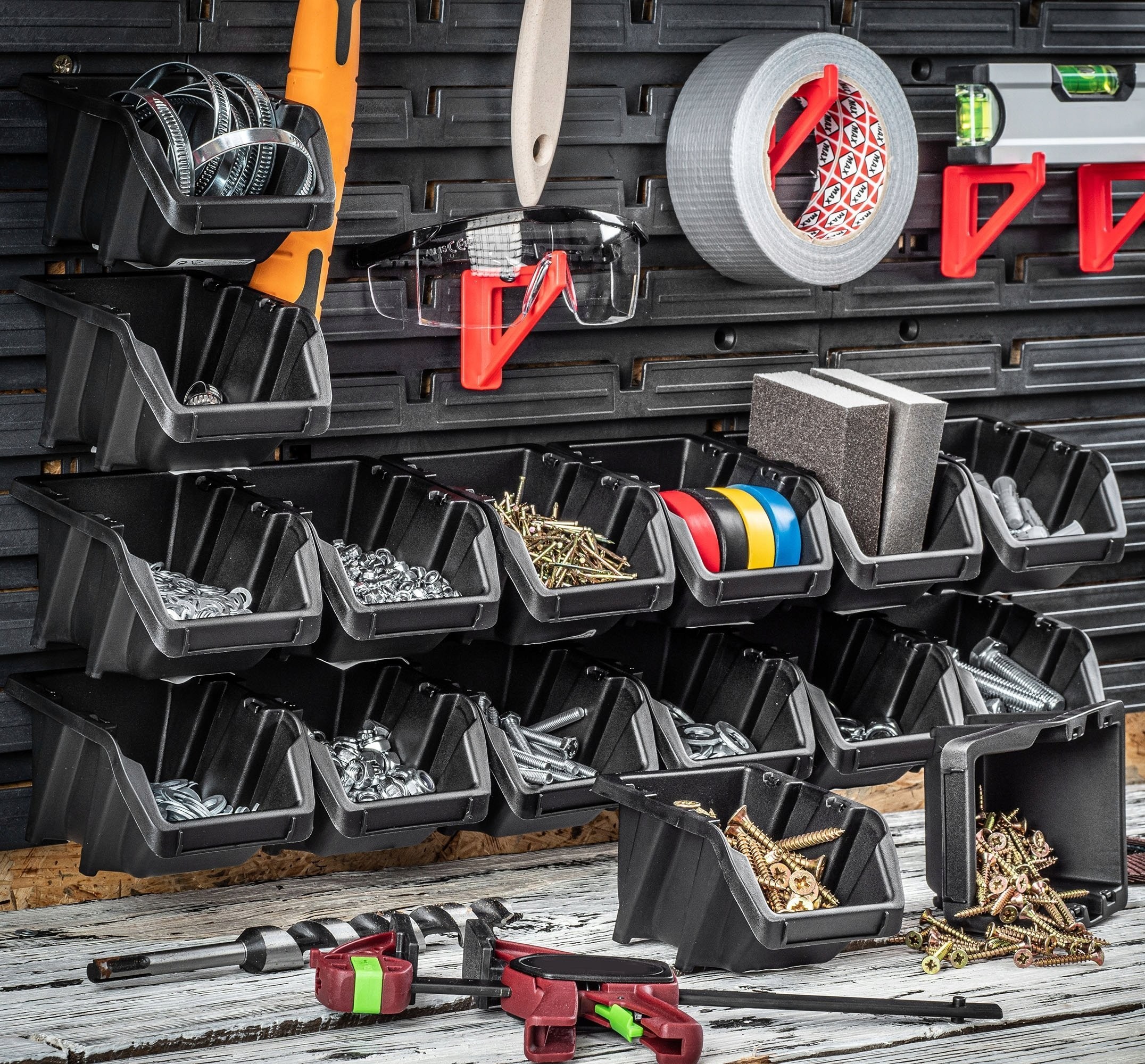 MODUŁOWA BUDOWA – ścianka narzędziowa ma konstrukcję modułową, dlatego możesz dowolnie poukładać akcesoria i rozbudować ją o kolejne elementy. Powiesisz na niej zarówno kuwety warsztatowe, półki i wieszaki na narzędzia.