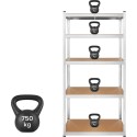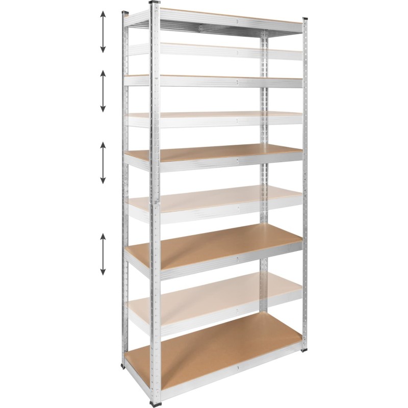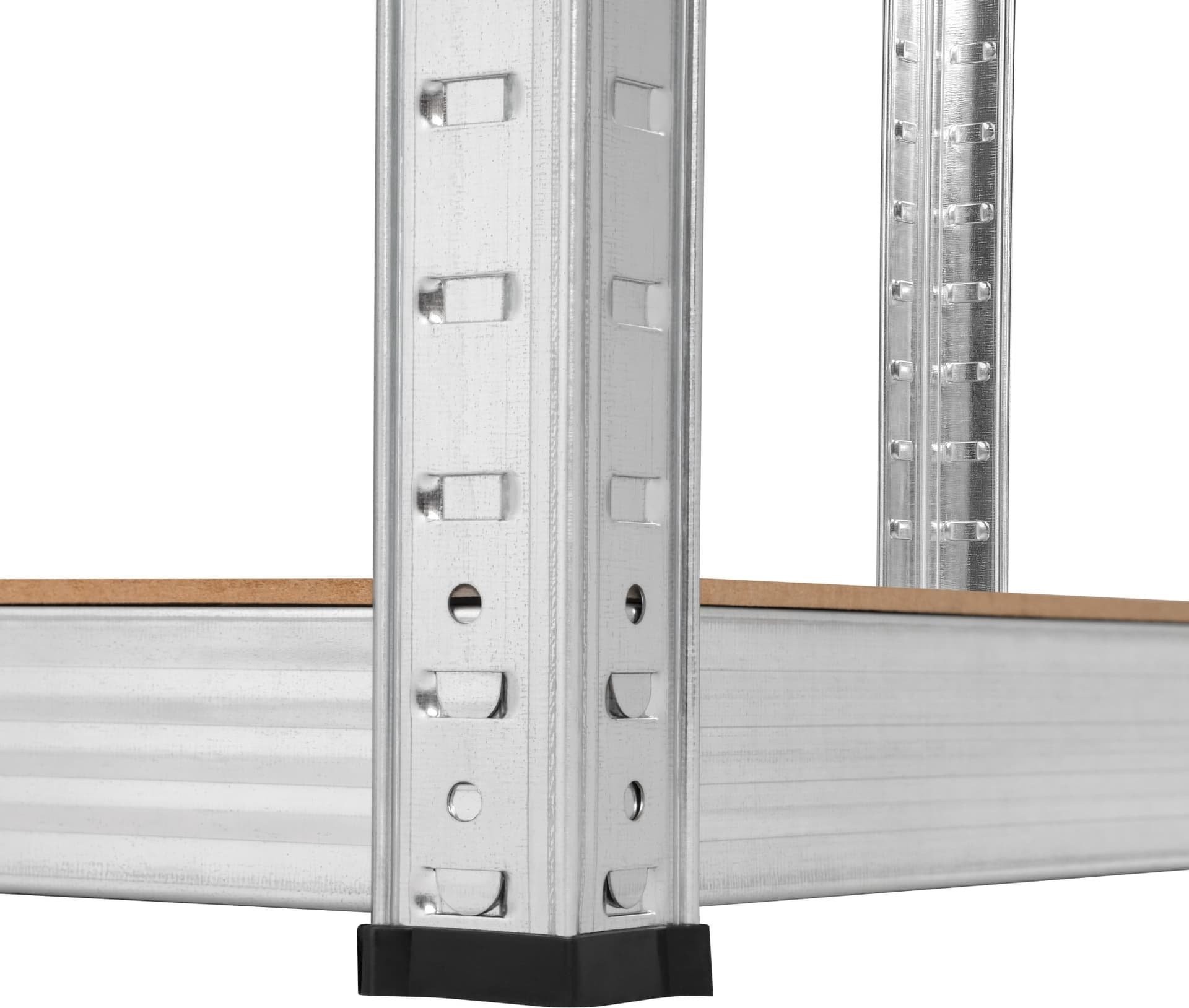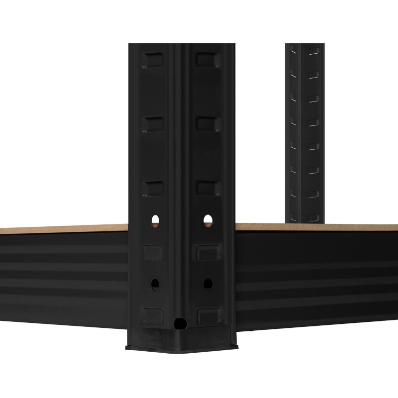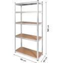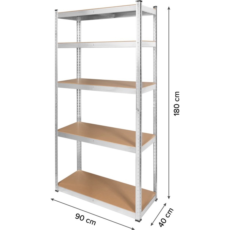 Wymiary: 180 x 90 x 40 cmLiczba półek: 5 szt.Półki z płyty MDFWsporniki środkowe półekProfile galwanizowaneGrubość profili: 0,5 mmNakładki ochronne w zestawie 8 szt.Maksymalne obciążenie półki: 150 kg (przy równomiernym obciążeniu)Maksymalne obciążenie łączne: 750 kgSposób montażu: bezśrubowy (na wcisk)Regał należy przytwierdzić do ścianyKolor: czarny ocynk
