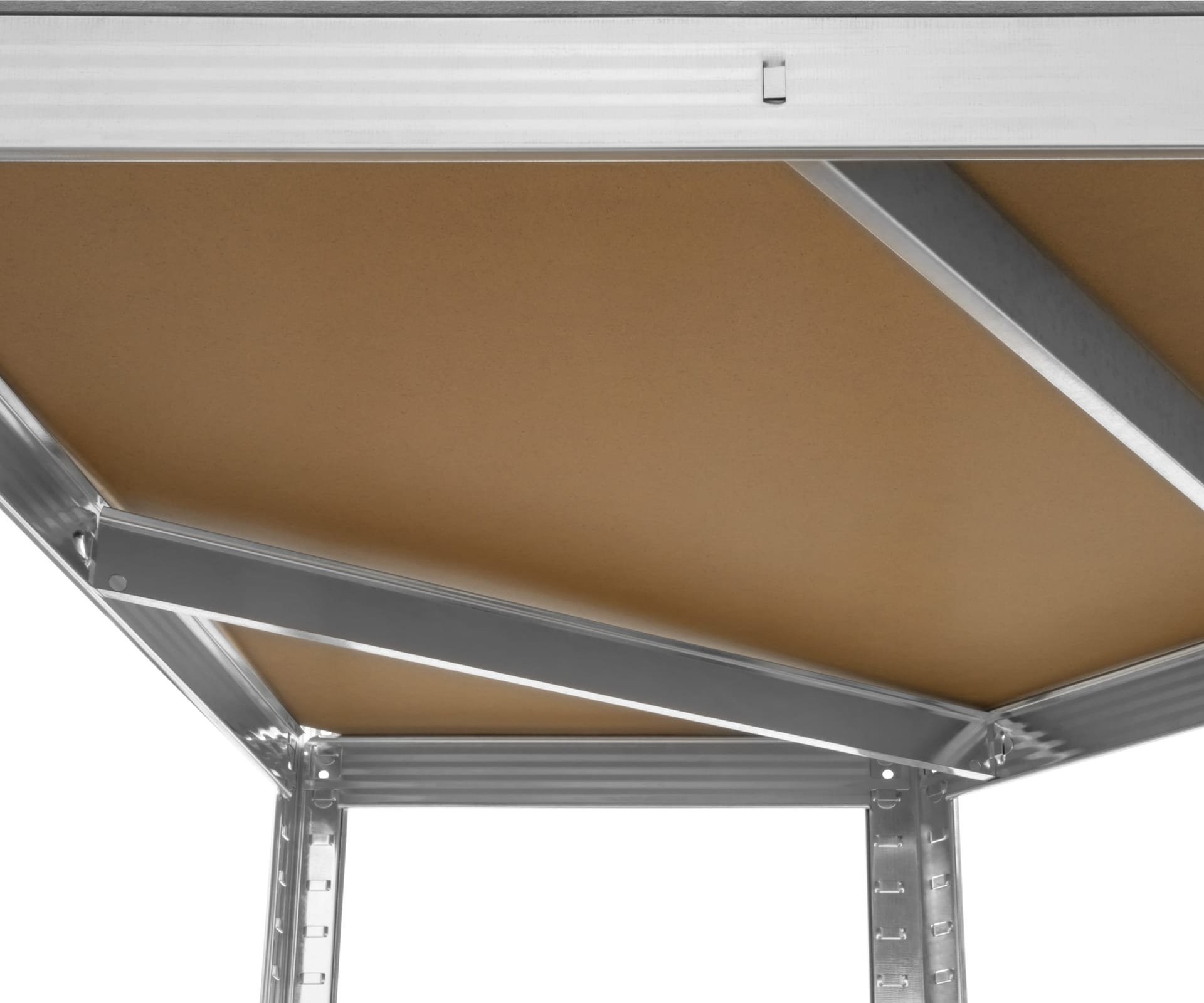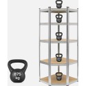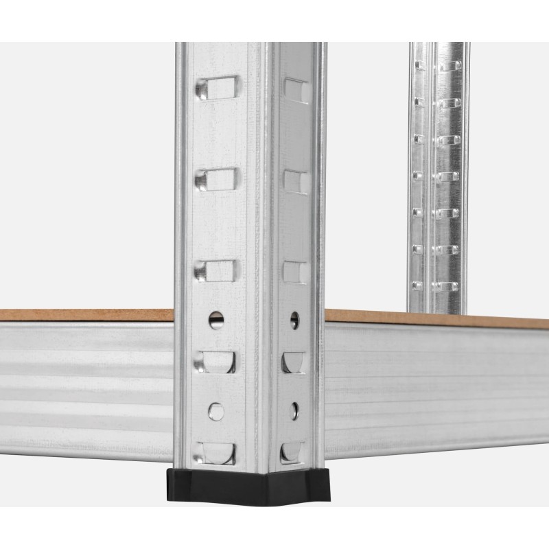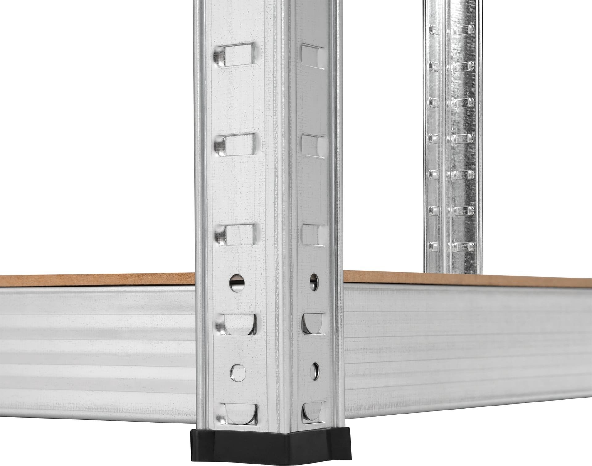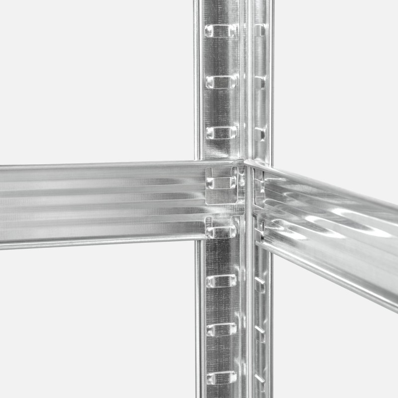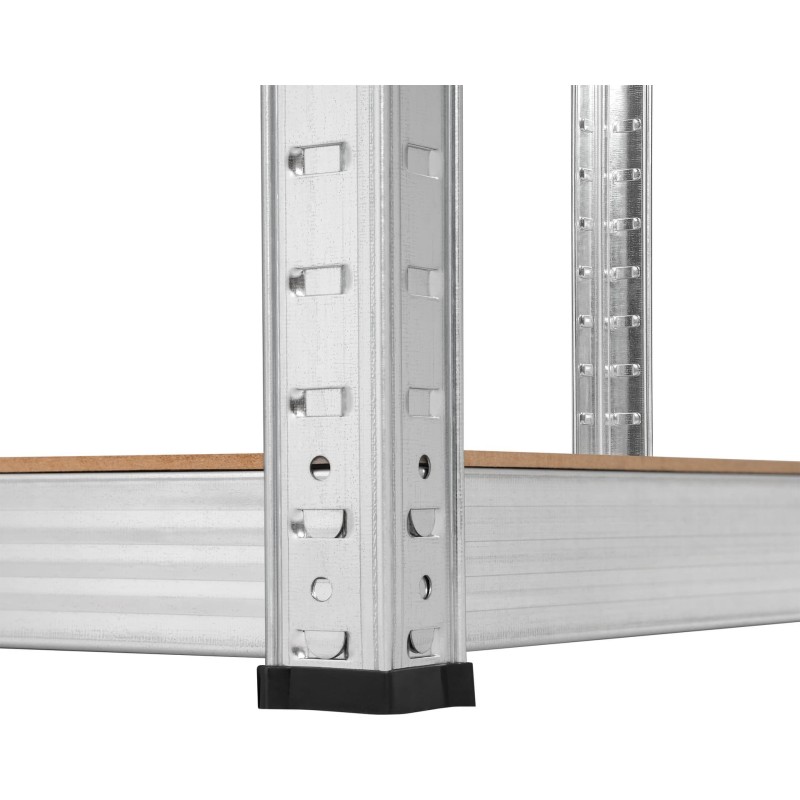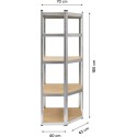 Wymiary: 40 x 43.43 x 40 x 70 x 70 x 180 cmLiczba półek: 5 szt.Półki z płyty MDFWsporniki środkowe półekProfile galwanizowaneGrubość profili: 0,5 mmNakładki ochronne w zestawie 8 szt.Maksymalne obciążenie półki: 175 kg (przy równomiernym obciążeniu)Maksymalne obciążenie łączne: 875 kgSposób montażu: bezśrubowy (na wcisk)Regał należy przytwierdzić do ścianyKolor: srebrny ocynk