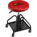 Stołek warsztatowy, z regulowaną wysokością i obracanym siedziskiem. Posiada osadzone obrotowo kółka, a pod siedziskiem półkę na narzędzia....
