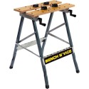 Stolik warsztatowy z mechanizmem zaciskania obrabianego materiału i systemem szybkiego składania / rozkładania do zastosowań mobilnych.