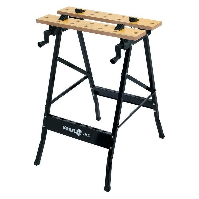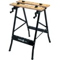 Składany stół roboczy z blatem wykonanym z grubej płyty MDF. Płyta robocza składająca się z dwóch części o wymiarach 560 x 100 x 18 mm, działa na zasadzie imadła. Można między nimi zacisnąć obrabiany element. W płytach znajdują się otwory do założenia elementów mocujących materiał. Podstawa stołu wykonana jest z metalowych profili o przekroju 20 x 20 mm. Części metalowe zabezpieczone antykorozyjnie , malowane proszkowo. Nogi zakończone antypoślizgowymi , tłumiącymi drgania stopkami z wykonanymi z PVC. Dopuszczalne obciążenie stołu wynosi 70 kg