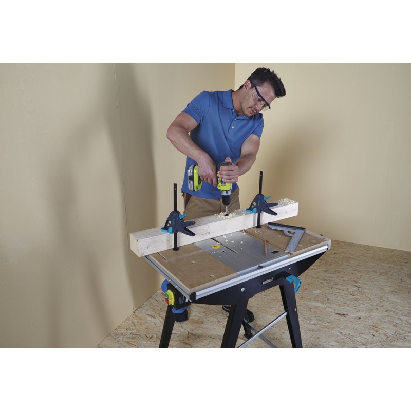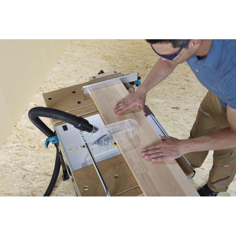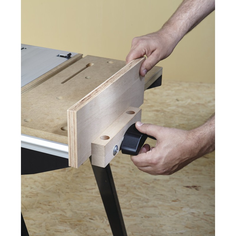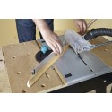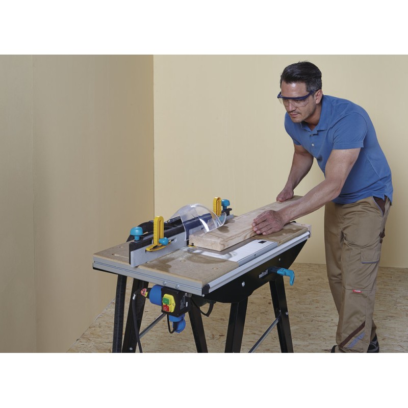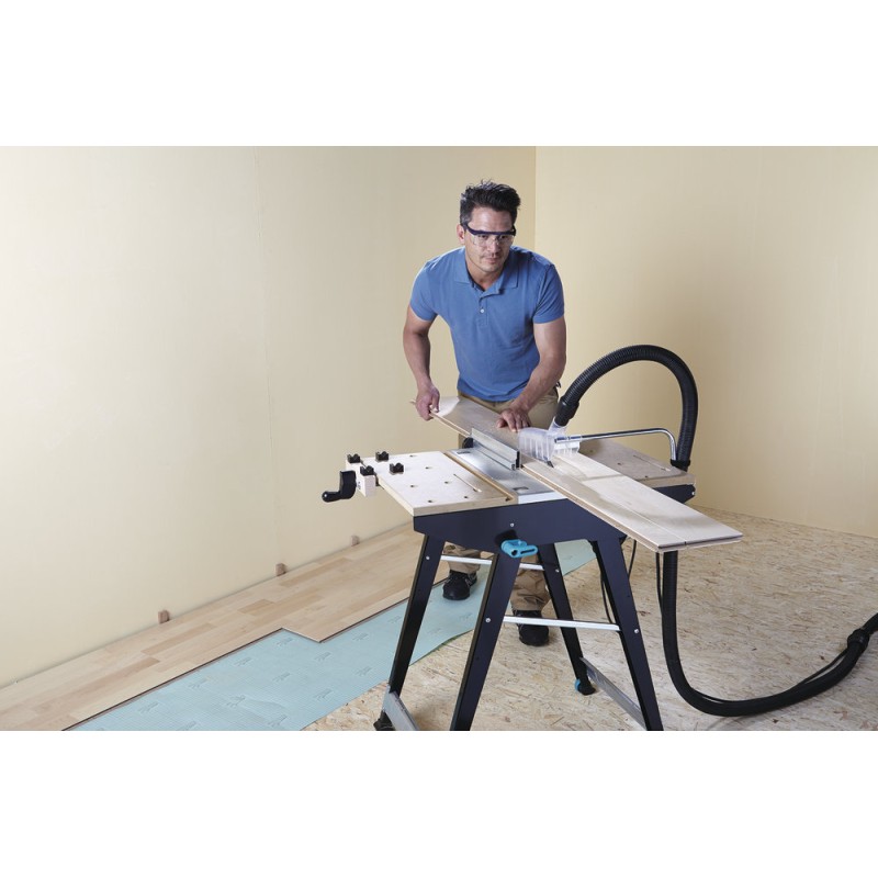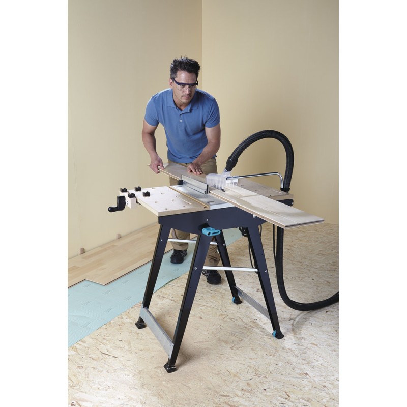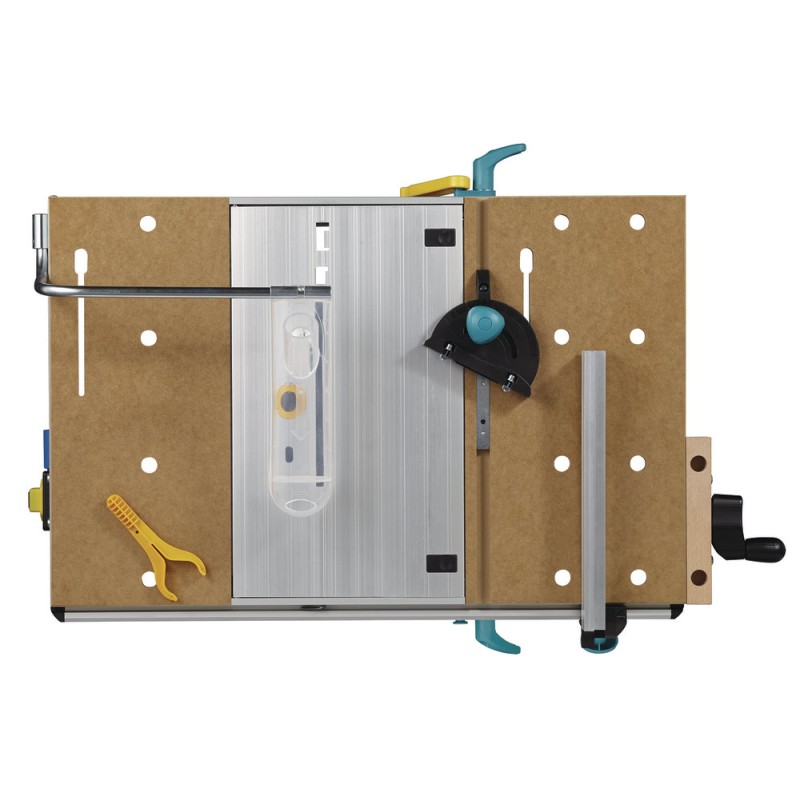 - możliwość zastosowania jako stół maszynowy współpracujący z ręczną pilarką tarczową, wyrzynarką lub frezarką górnowrzecionową (wyłącznie w połączeniu z prowadnicą frezarską - art. nr 6901000), oraz jako stół roboczy