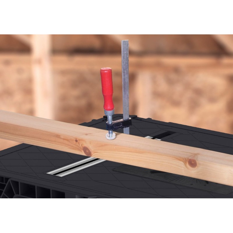 Stacja robocza zawiera 4 wsporniki tzw. zaciski, które mocowane są w prowadnicach w blacie. Dzięki tej możliwości bez problemu zamocujesz dodatkową deskę, a tym samym powiększysz swoją powierzchnię roboczą. Za pomocą wsporników wyregulujesz wielkość swojego stołu. Produkt został wyprodukowany z myślą nawet dla najbardziej wymagających. Możesz być spokojny, pod wpływem nacisku ciężkich narzędzi żaden z Twoich elementów nie zmieni swojego miejsca położenia. Praca Twoja i Twoich pracowników jest w pełni bezpieczna.