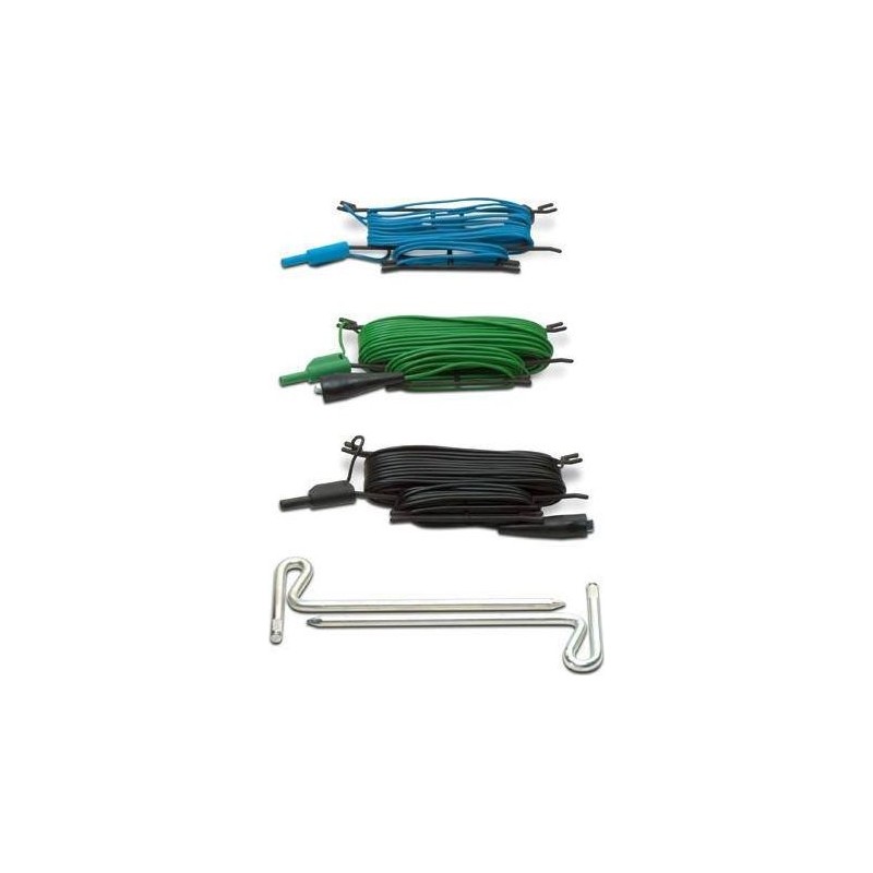 - Zestaw do pomiaru uziemienia: 2 pręty uziemiające, 3 kable testowe (2 x 20 m, 1 x 4,5 m).