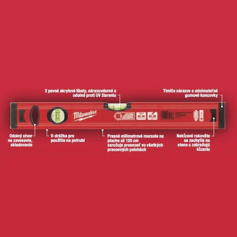 MILWAUKEE REDSTICK SLIM Poziomica magnetyczna 180cm Poziomica magnetyczna z dwoma libellami akrylowymi, odpornymi przed upadkami czy promieniowaniem UV. Poziomica posiada nakładki antypoślizgowe oraz otwór umożliwiający powieszenie na ścianie. Wysoka precyzja potwierdzona certyfikatem VPA nadawanym przez niezależny instytut niemiecki.