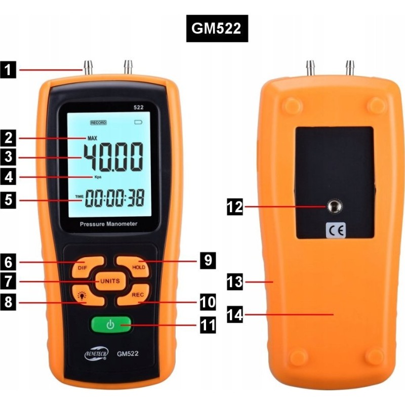 Manometr Benetech GM522 posiada wyraźny wyświetlacz, który informuje o aktualnych pomiarach oraz poziomie naładowania baterii. Dodatkowe funkcje, takie jak tryb zapisu danych oraz możliwość zmiany jednostek, sprawiają, że obsługa urządzenia jest intuicyjna i komfortowa.