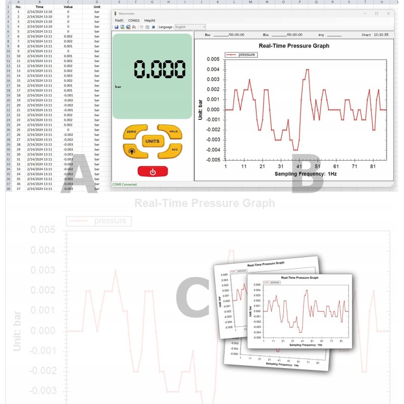 Manometr jest wyposażony w funkcję komunikacji przez USB, co umożliwia podłączenie go do komputera. Dedykowane oprogramowanie na system Windows pozwala na odczytywanie danych w czasie rzeczywistym oraz ich eksportowanie, co ułatwia tworzenie dokumentacji technicznej i analizę wyników.