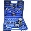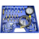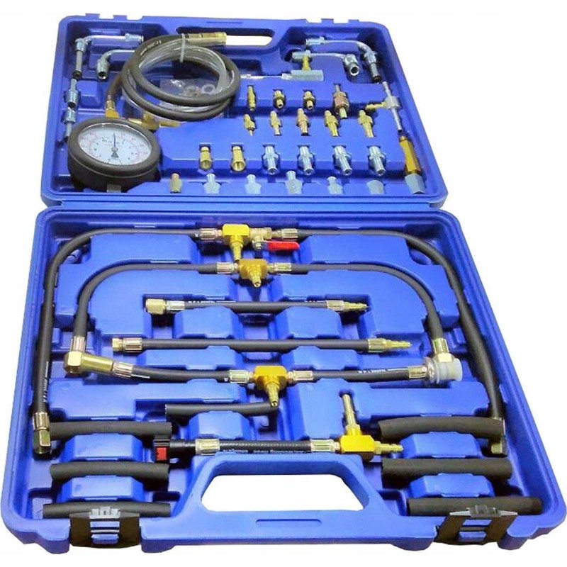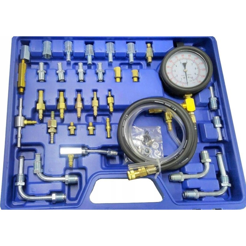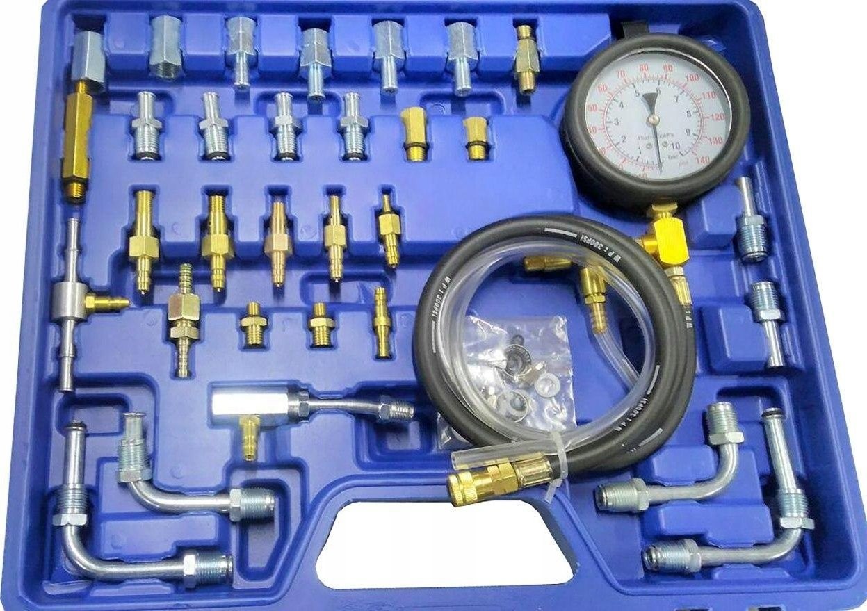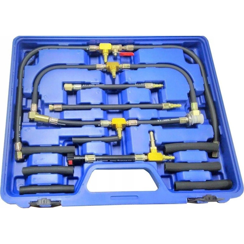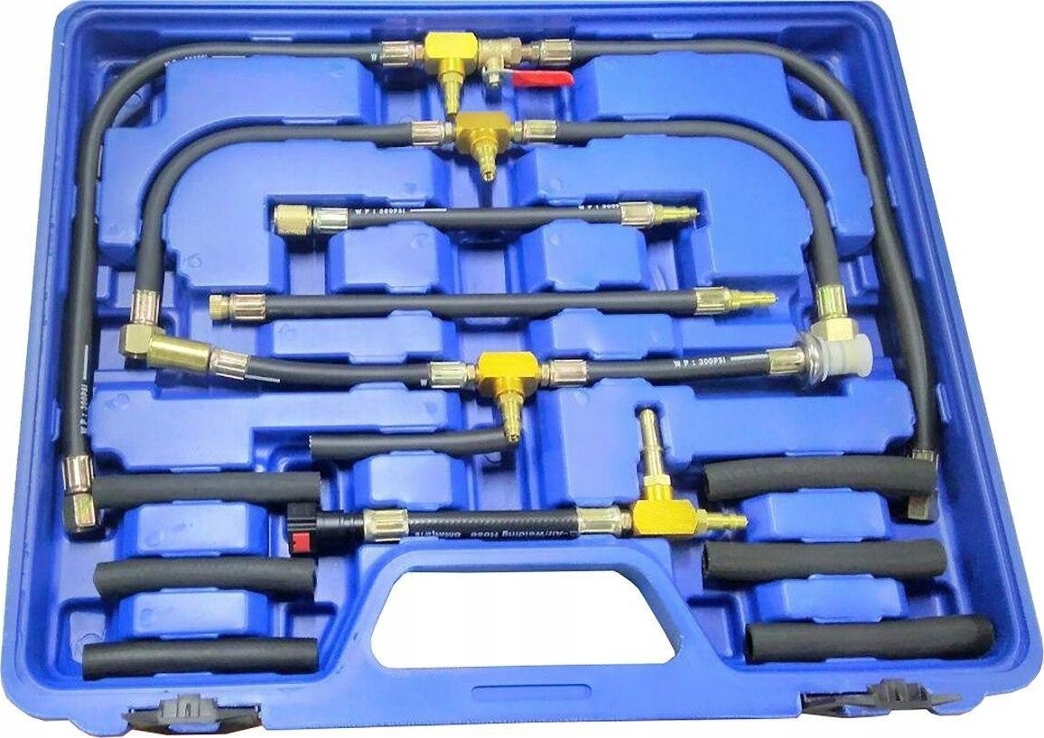Zestaw do badania systemów wtryskowych w silnikach benzynowych, zakres do 140 PSI / 10 bar. Do układów: układ K - i KE - Jetronic sis, układ KE - Jetronic kic, układ L - Jetronic liw, pomiar ciśnienia w pompach, pomiar powrotu ciśnienia. Tester służy do pomiaru ciśnienia paliwa w układzie paliwowym większości marek samochodowych.
