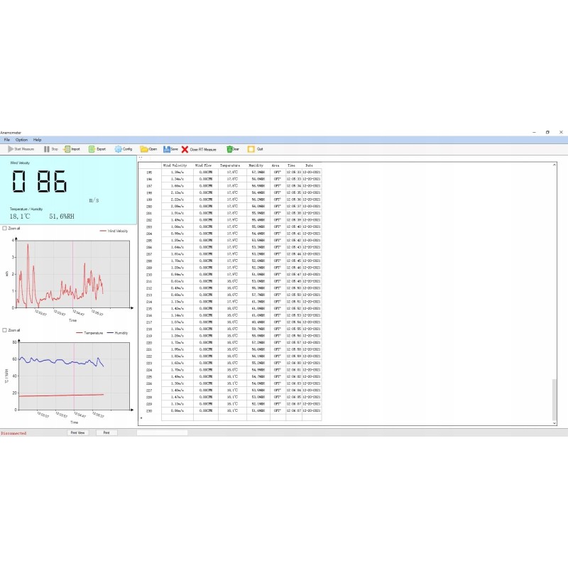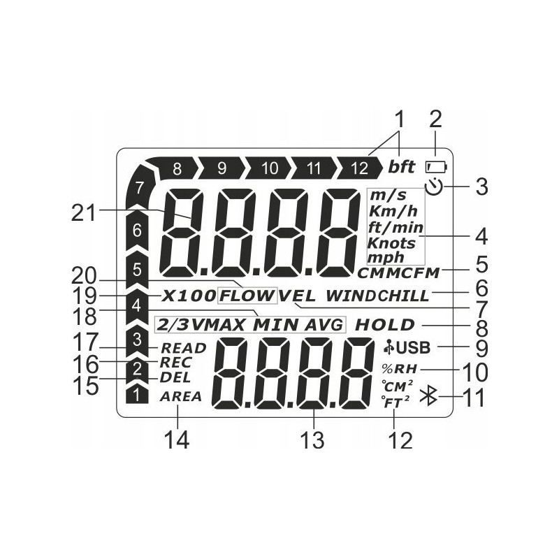 - Zakres prędkości wiatru: 0-30 m/s / 0-5860 Ft/min / 0-55 węzłów / 0-90 km/h / 0-65 mph