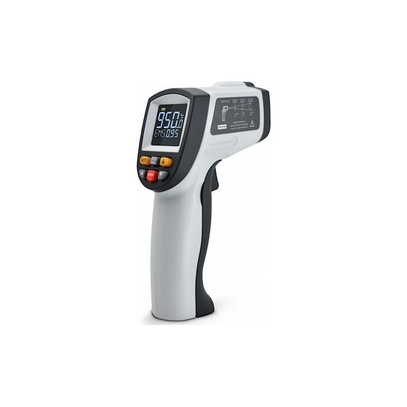 Urządzenie wyposażone jest w celownik laserowy, który umożliwia precyzyjne nacelowanie badanego punktu. W urządzeniu zastosowano dobrej jakości materiały, a ergonomiczna budowa poprawia wygodę użytkowania termometru. Podświetlany wyświetlacz umożliwia pracę z urządzeniem w ciemności. Pirometr wyposażony jest w funkcję automatycznego wyłączenia zwiększając oszczędność w zużyciu baterii.
