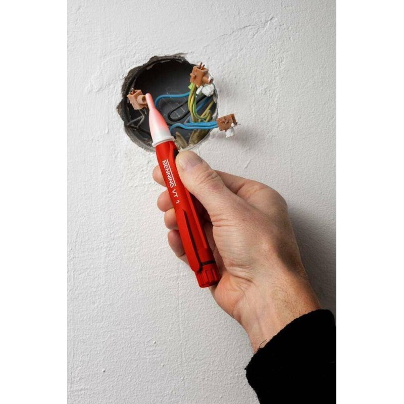 Próbnik faz, indukcyjny Wykonanie: prąd przemienny. Z odpornego na pękanie tworzywa sztucznego ABS z podświetlaną na czerwono okrągłą końcówką kontrolną i izolowanym klipsem z tworzywa sztucznego. Dostawa z 2 bateriami micro AAA/LR03.Zastosowanie: do bezkontaktowego sprawdzania faz puszek wtyczkowych i przyłączeniowych, wyłączników itp. oraz do wykrywania przerw i zakłóceń w przewodach izolowanych i pod napięciem.