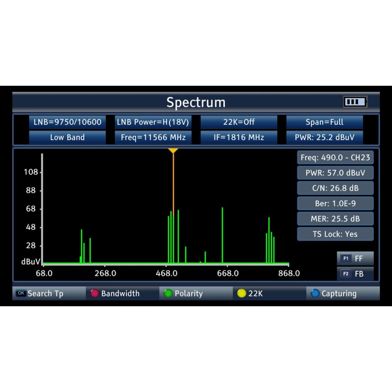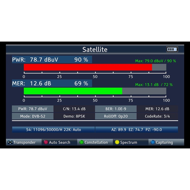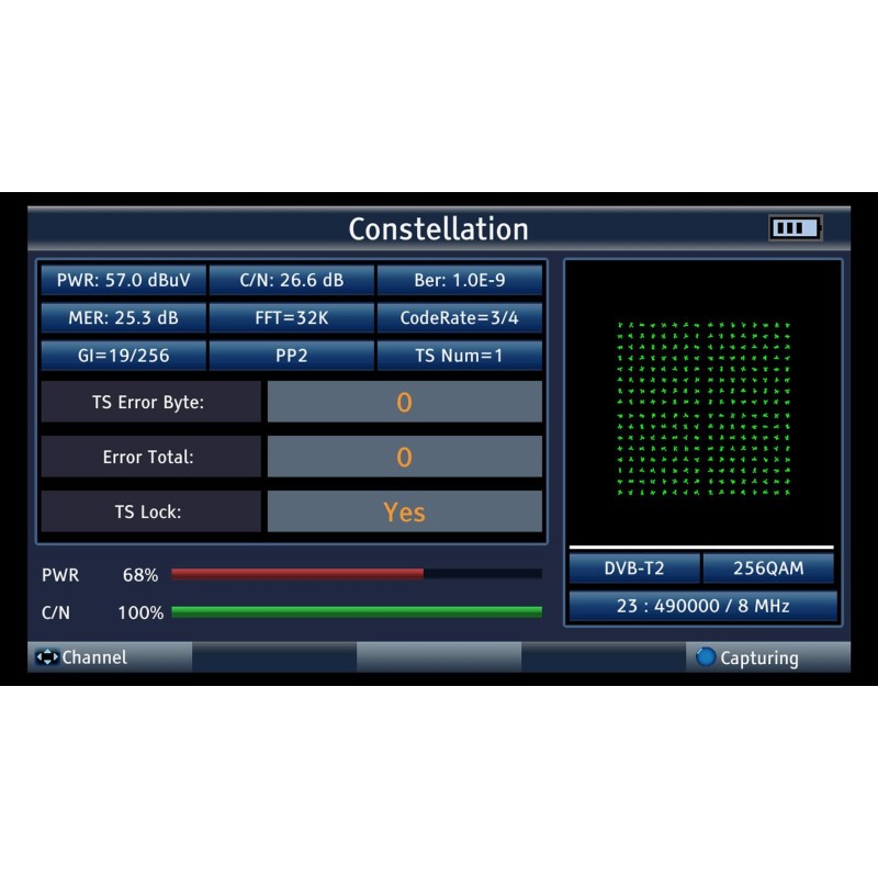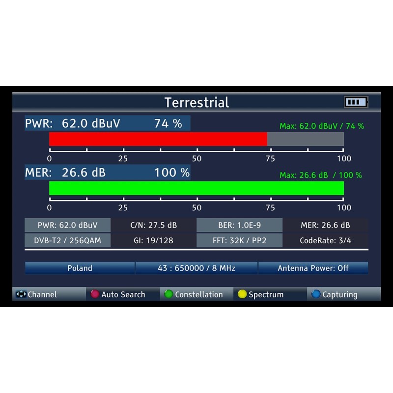 Ponadto, zewnętrzne wejście oraz wyjście HDMI umożliwia podłączenie źródła sygnału oraz wyświetlenie obrazu na TV poprzez kabel HDMI. Urządzenie pozwala na pomiar takich parametrów jak: poziom sygnału wyrażany w dBμV, C/N, MER.