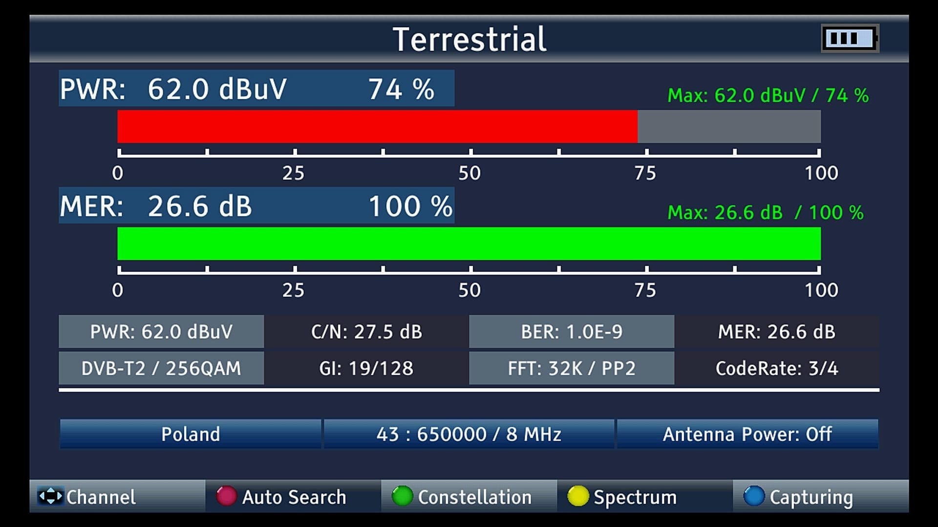 - Pomiar wszelkich niezbędnych parametrów sygnału takich jak: Poziom sygnału wyrażany w dBμV, C/N, BER, MER