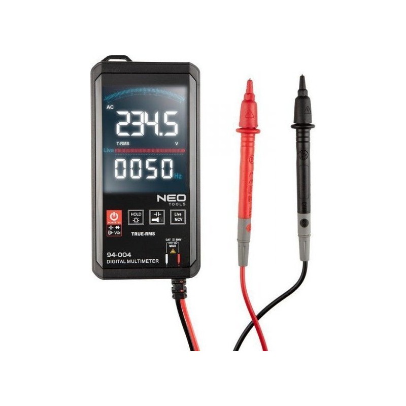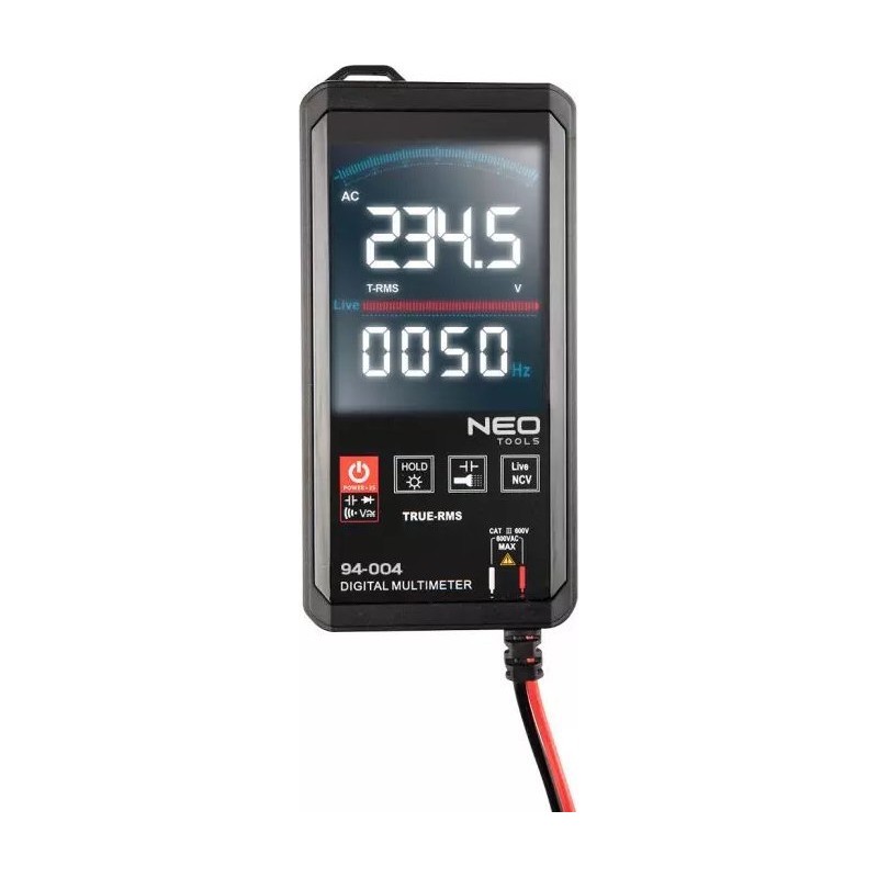 Precyzyjny miernik cyfrowy kolorowy od marki NEO, przeznaczony do specjalistycznych pomiarów przeprowadzanych w pewnych odstępach czasu. Posiada wyświetlacz LCD z możliwością podświetlenia, umożliwiający ukazanie wartości do nawet 5999. Dwie, wbudowane sondy pomiarowe wpływają na wysoką jakość uzyskanych wyników. Panel dotykowy pozwala na wygodne korzystanie z narzędzia, wykorzystując jego szeroką gamę dostępnych funkcji.