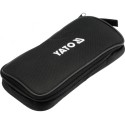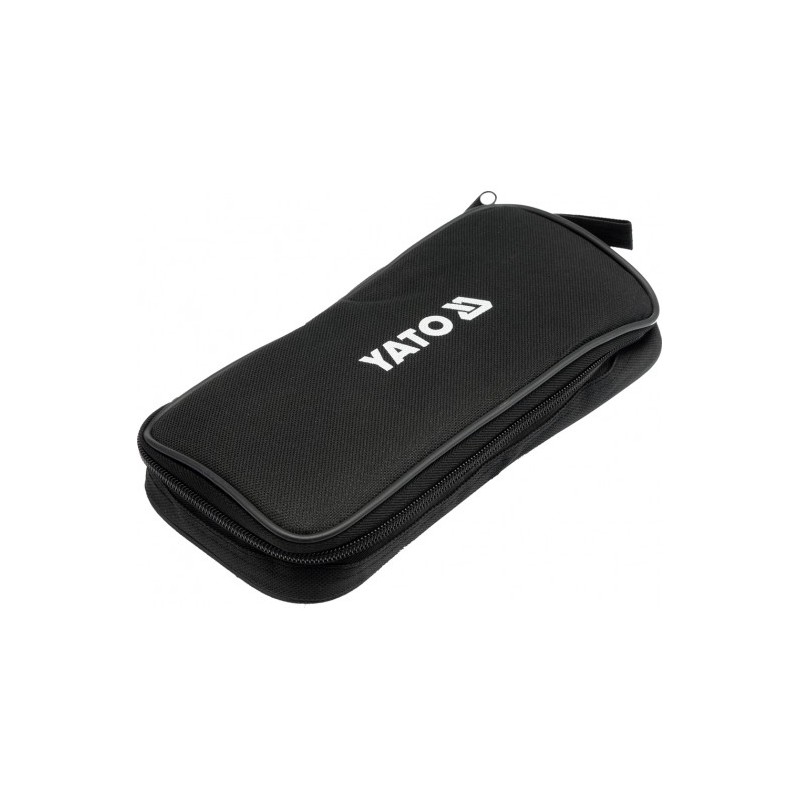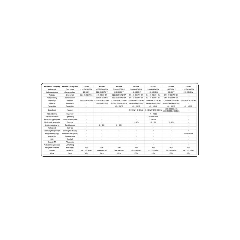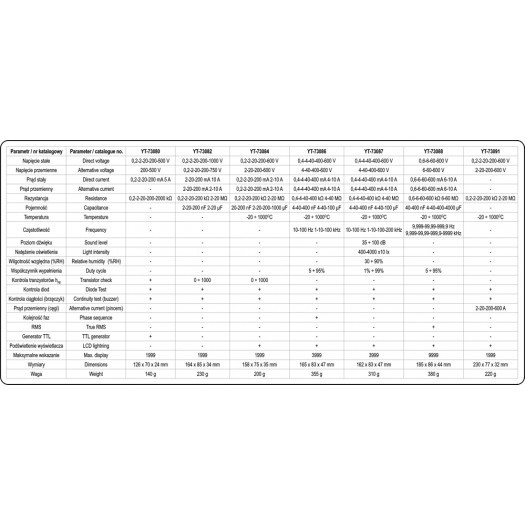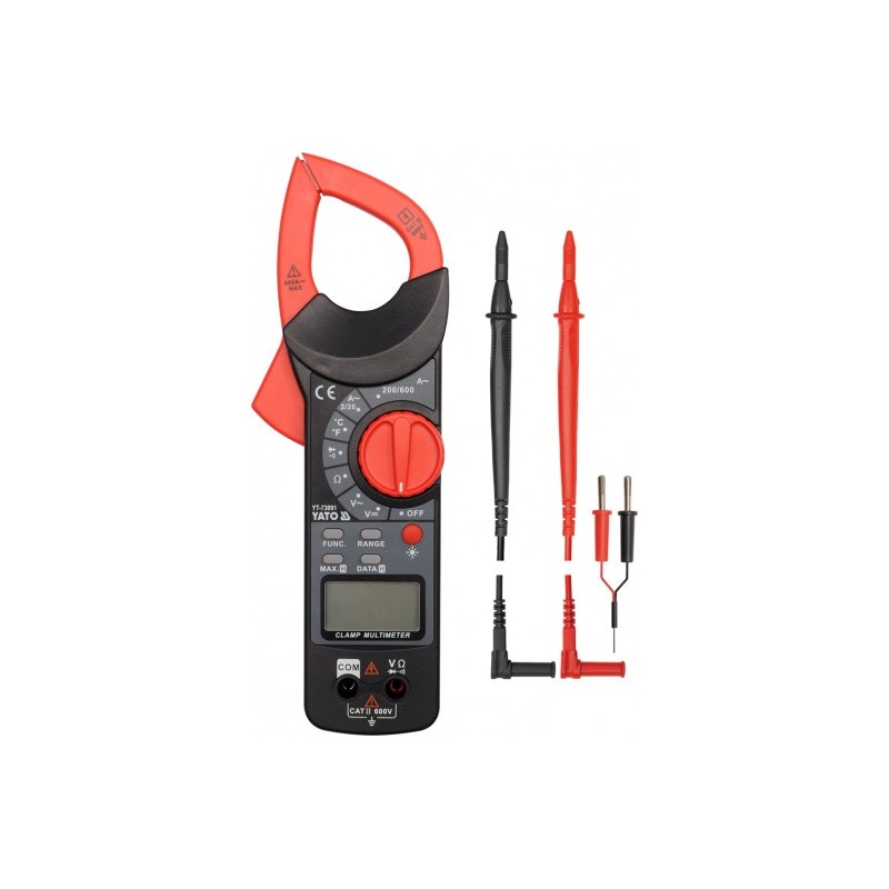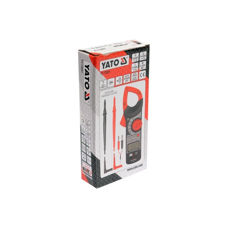 Miernik uniwersalny YT-73091 wyposażony jest w cęgi pomiarowe, które pozwalają na pomiar natężenia prądu przemiennego w pojedynczym przewodzie metodą indukcyjną. Pozwala to na pomiar znacznie wyższych prądów, niż w wypadku konwencjonalnych mierników elektrycznych z serii YT-7308X (do 600A). Maksymalna średnica przewodu badanego przez multimetr YT-73091 to 37mm Oprócz pomiaru wartości przemiennego prądu, można tym urządzeniem zmierzyć napięcie stałe, napięcie przemienne, rezystancję, temperaturę i skontrolować działanie diod. Brzęczyk jest przydatny przy inspekcji instalacji elektrycznych - pozwala nam na łatwe zweryfikowanie ciągłości obwodu. Funkcja automatycznego wyłączania multimetru pozwala na zaoszczędzenie baterii. Dodatkowy pokrowiec chroni multimetr przed upadkami i uderzeniami w transporcie. Ponadto miernik cyfrowy YT-73086 pozwala na pomiar temperatury, co jest szczególnie przydatne przy wykrywaniu wadliwych komponentów instalacji elektrycznych (zwiększony opór np. uszkodzonego przewodu wywołuje nagrzewanie komponentu). Przycisk „DATA H" służy do zachowania na wyświetlaczu zmierzonej wartości. Przycisk „MAX H" służy do zachowania na wyświetlaczu najwyższej zmierzonej wartości. Oba te przyciski są bardzo przydatne w przypadku pomiarów o dużej zmienności. Podświetlany ekran miernika umożliwia pracę w warunkach słabego oświetlenia.